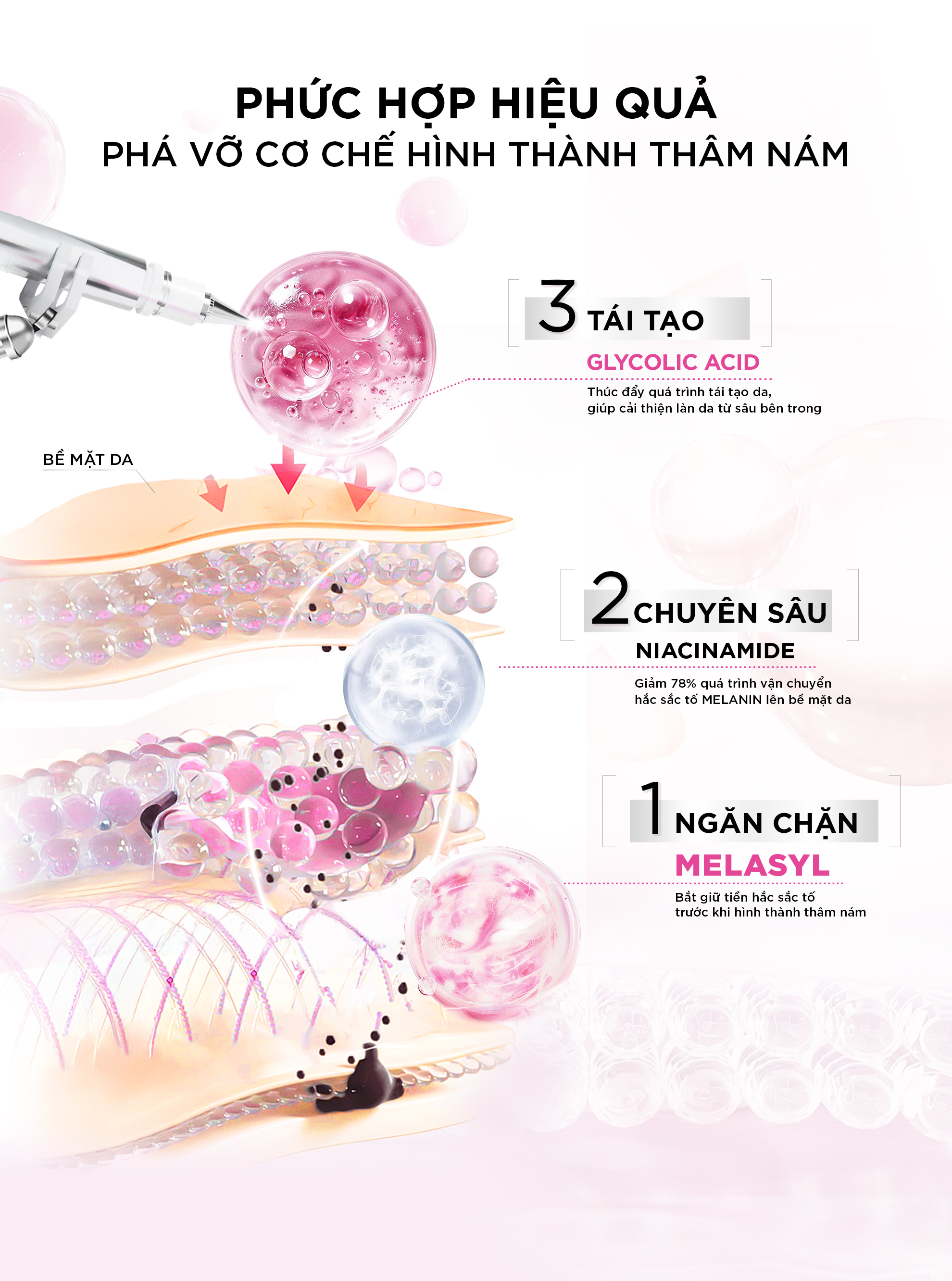 8% [Melasyl + Glycolic + Niacinamide]: ngăn chặn hắc sắc tố xuất hiện, làm mờ thâm nám.