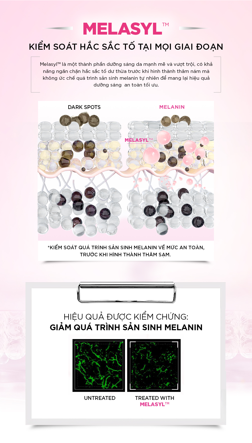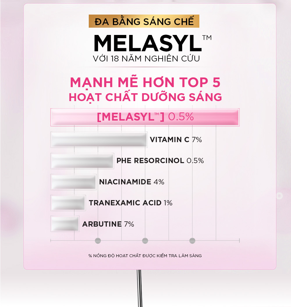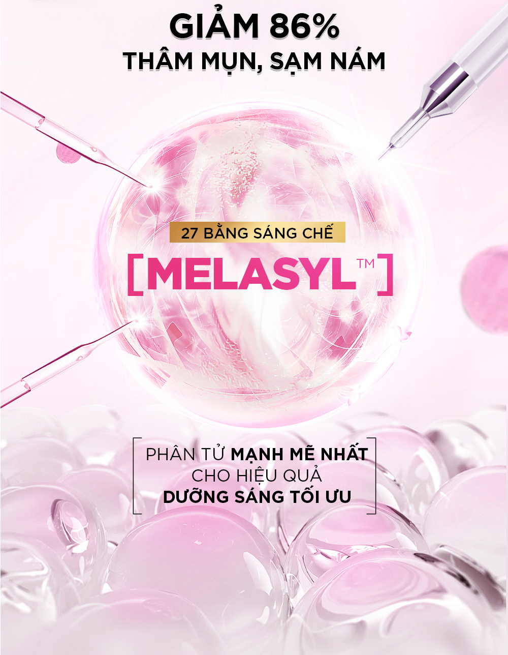 • Serum dưỡng sáng Glycolic-Bright MỚI với thành phần đột phá sáng da MelasylTM từ viện nghiên cứu L’oreal Paris – hiệu quả hơn 5 hoạt chất sáng da phổ biến, cùng phức hợp hoạt chất 8% [Melasyl+Glycolic+Niacinamide] giúp mang đến khả năng vượt trội GIẢM 86% THÂM MỤN & NÁM*.