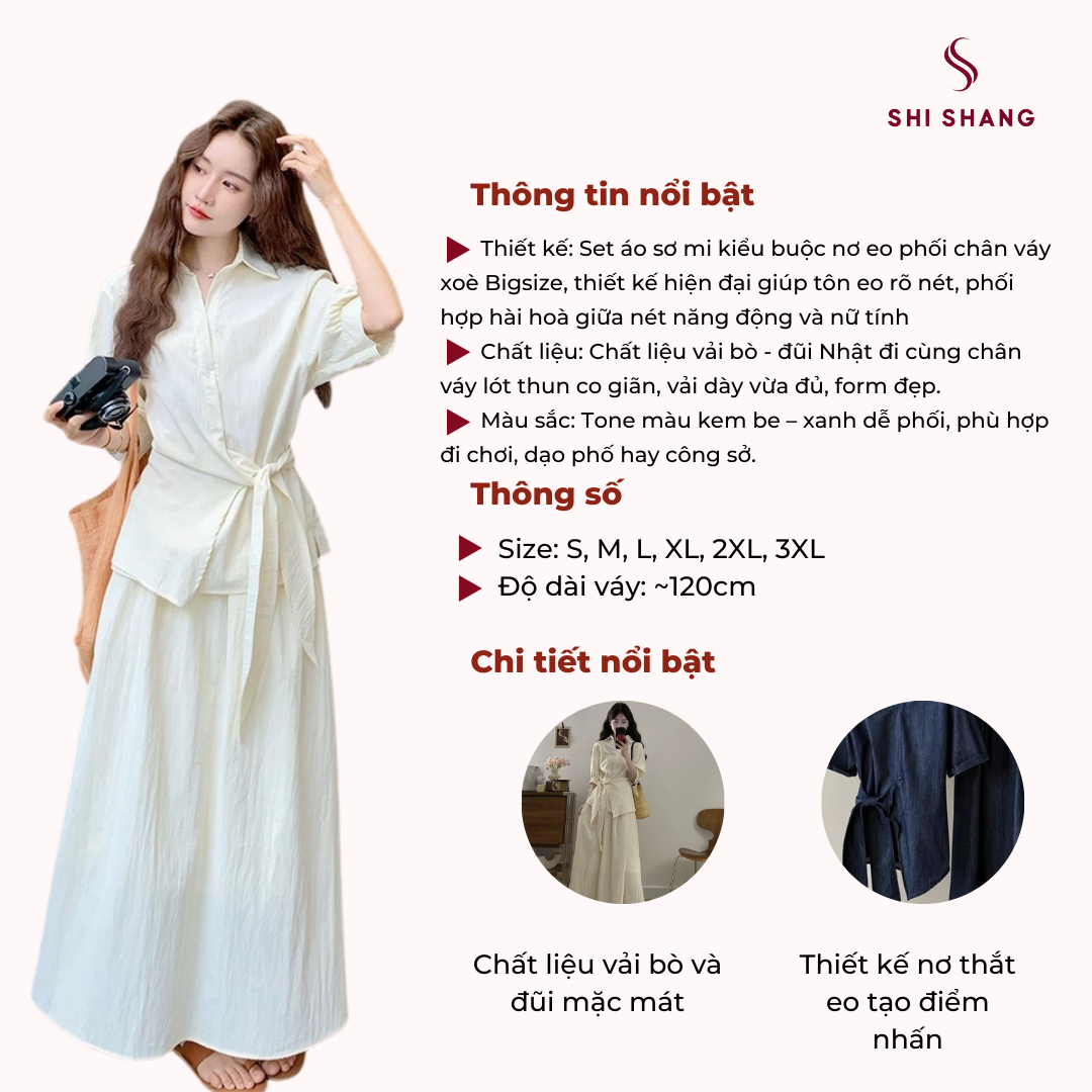 [𝐓𝐡𝐞̂𝐦 𝐦𝐚̀𝐮] Set thiết kế Shi Shang, áo sơ mi buộc nơ eo phối chân váy xoè có Bigsize