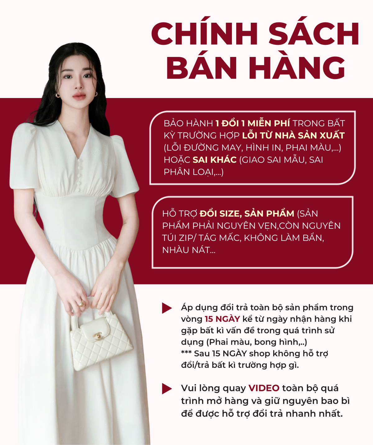 - Chính sách đổi trả linh hoạt (đổi màu, đổi mẫu, đổi size) nếu phát hiện lỗi từ shop.