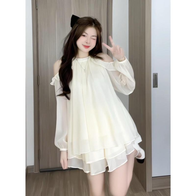 Set tơ bèo hở vai Lisssadress, set áo quần tiểu thư tay dài dilyshop Trơn Trơn Nữ Top, DILYSHOP_ S110