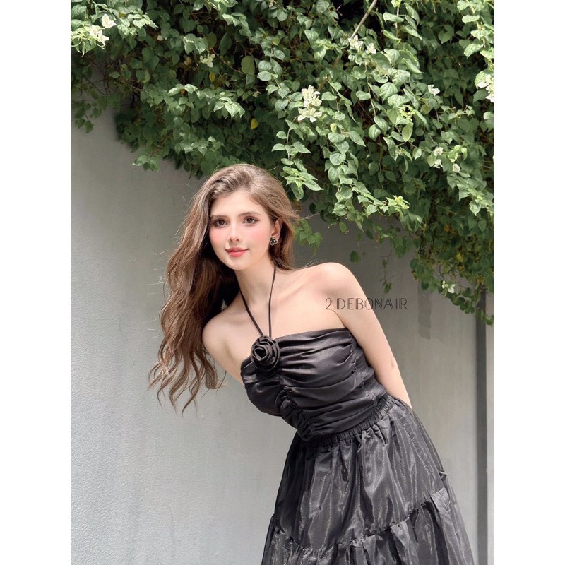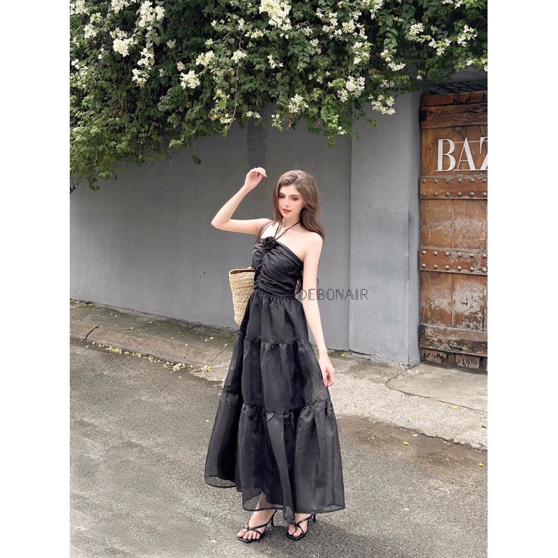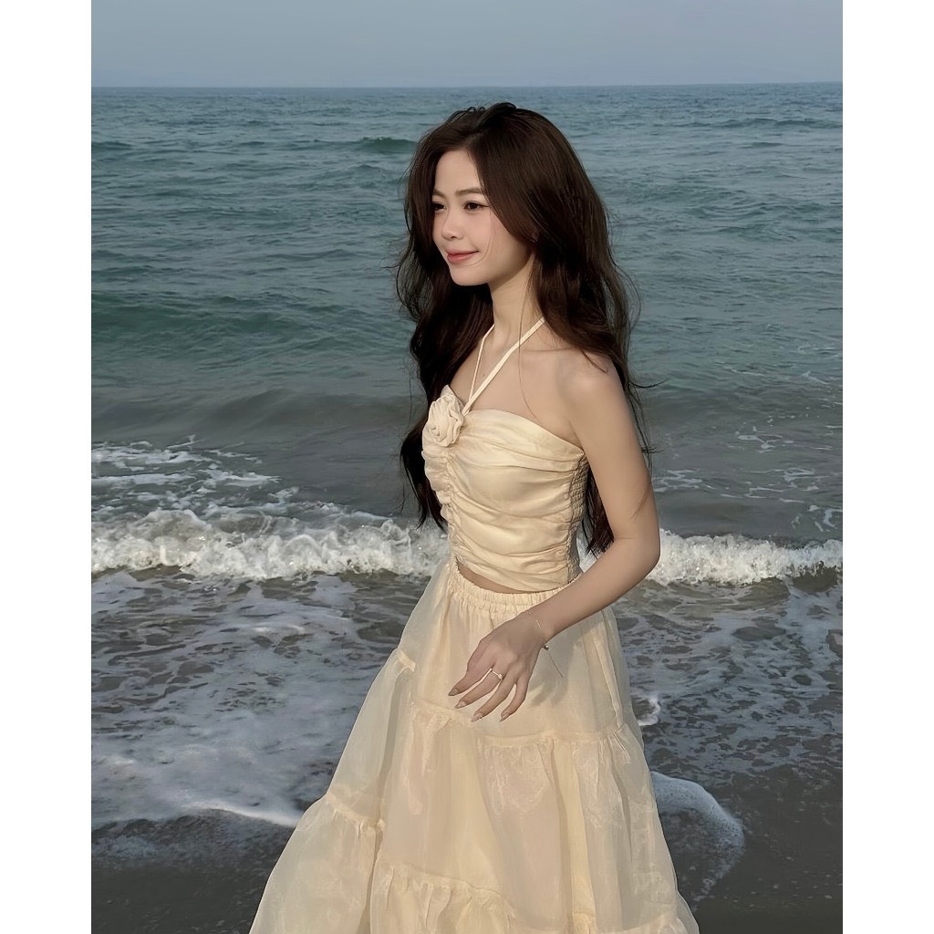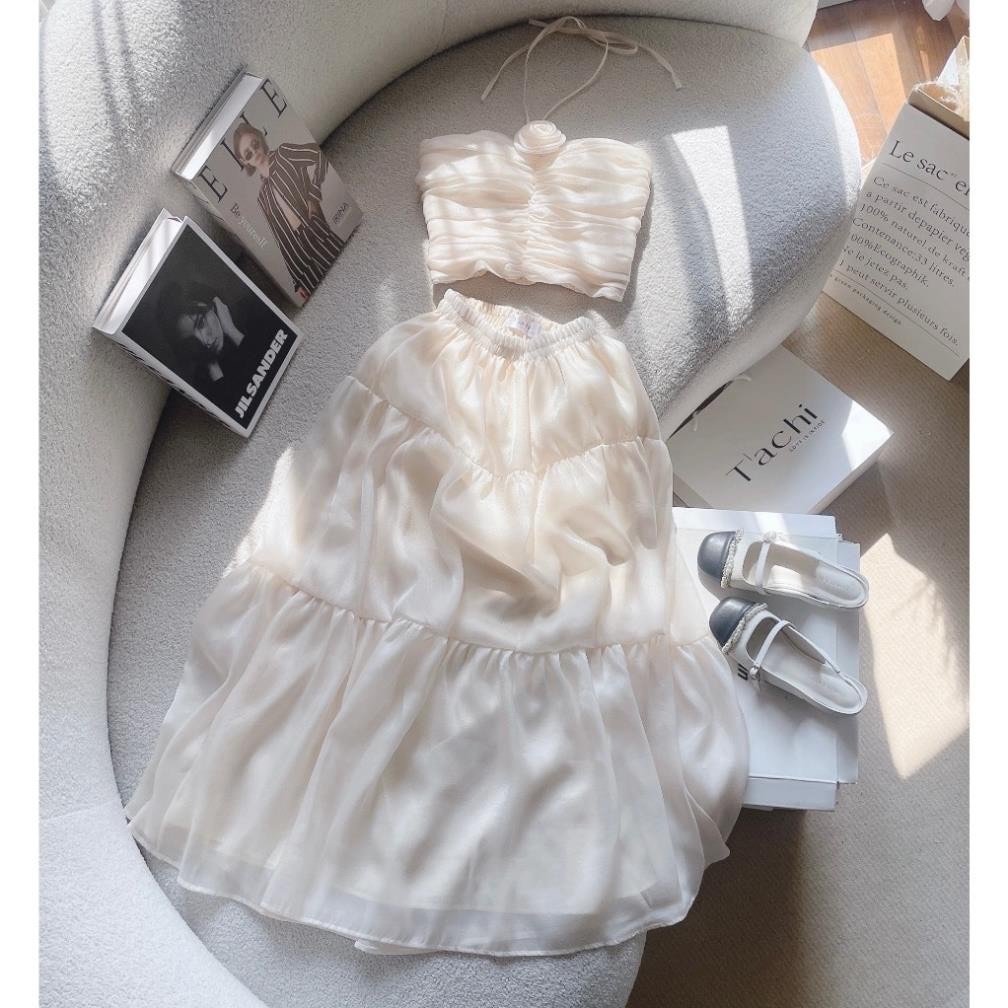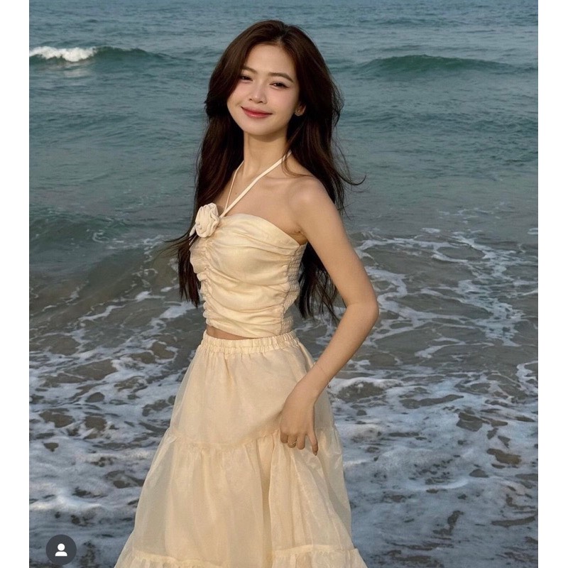 Sét váy maxi áo cúp nguc dây yếm gắn hoa kèm chân váy xoè dáng dài 2 lớp xinh xẻo B404 PANOSI