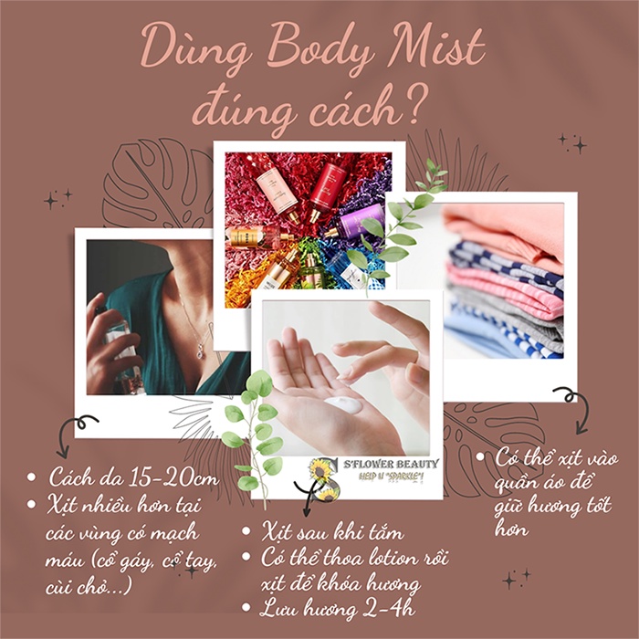 - Nếu bạn dùng xịt khoáng để cung cấp độ ẩm cho da mặt thì body mist là một loại xịt phun sương nhằm cung cấp độ ẩm, khoáng chất và các loại vitamin cho làn da kèm theo chức năng chính là lưu lại hương thơm tươi mới, dễ chịu cho da.