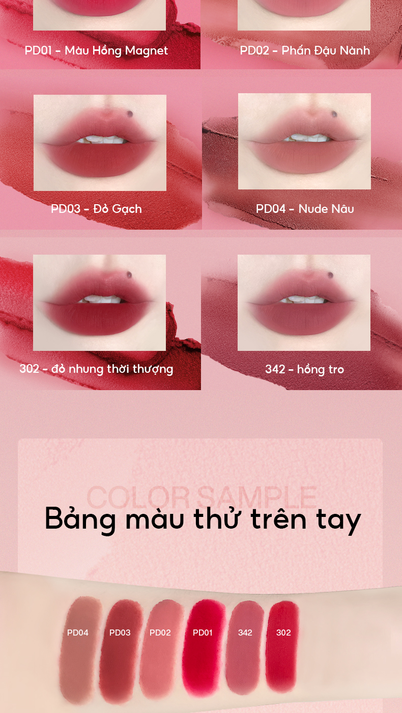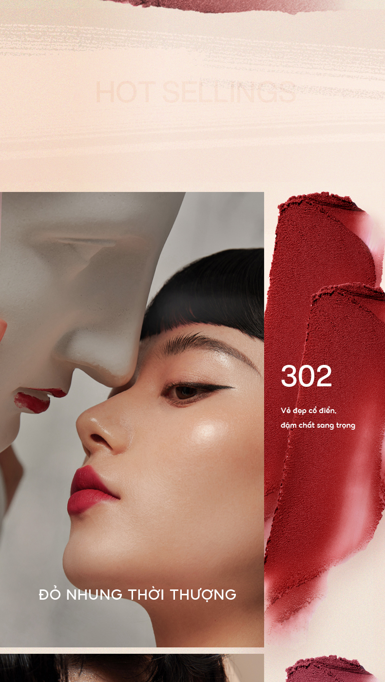 302 – Đỏ dâu trầm quyến rũ, tôn da, cực hợp khi đánh lòng môi hoặc full môi.