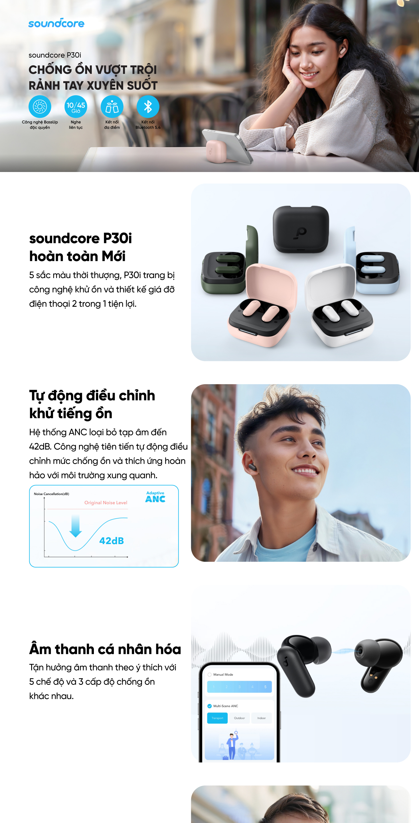 + ANC thích ứng: Tự động loại bỏ tiếng ồn lên đến 42dB, mang lại không gian yên tĩnh.