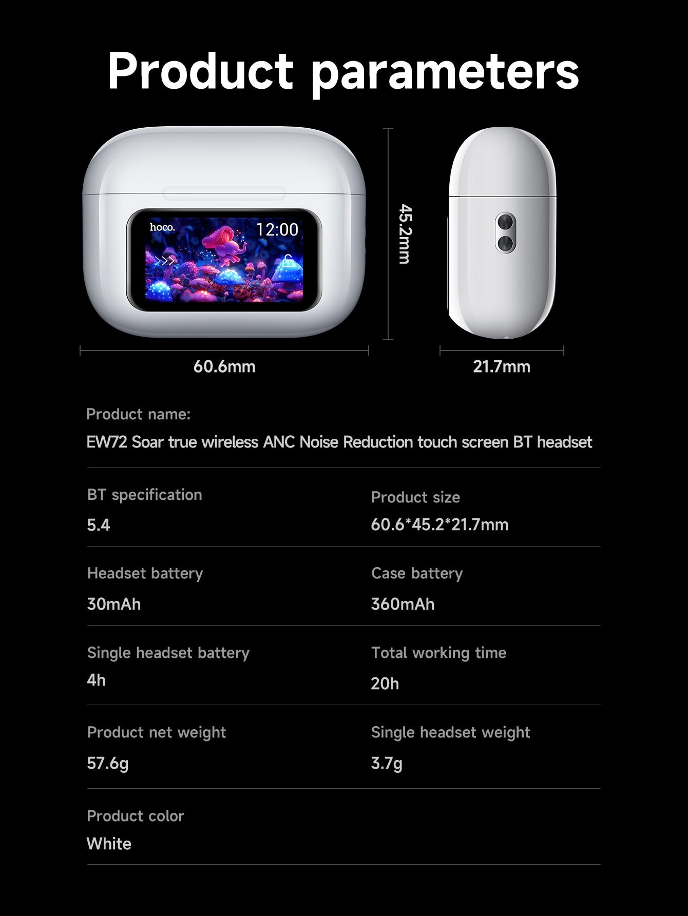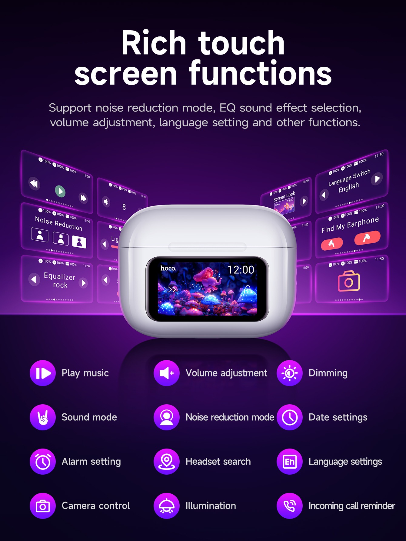 Màn hình LED cảm ứng: Hiển thị mức pin, thời gian thực, hỗ trợ các tính năng như tìm tai nghe, báo thức, điều khiển nhạc.