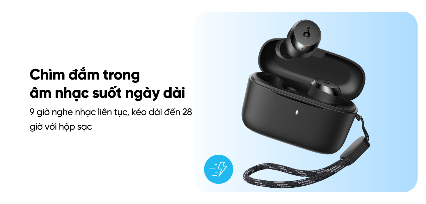 ✏️ Chìm đắm trong âm nhạc suốt ngày dài: 9 giờ nghe nhạc liên tục, kéo dài đến 28 giờ với hộp sạc. Sạc nhanh 10 phút cho 2 giờ nghe, không lo gián đoạn.