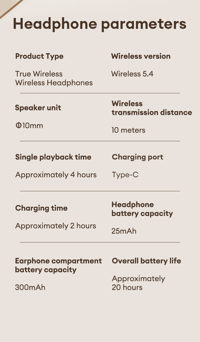 Dung lượng pin: Dung lượng hộp sạc là 300mAh, dung lượng pin mỗi tai nghe là 25mAh, hỗ trợ nguồn điện ổn định.