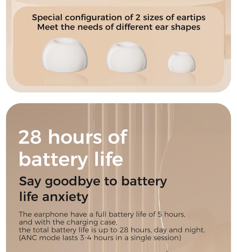 Thời lượng pin 28 giờ với hộp sạc, thời gian chơi 5 giờ cho một lần sạc;