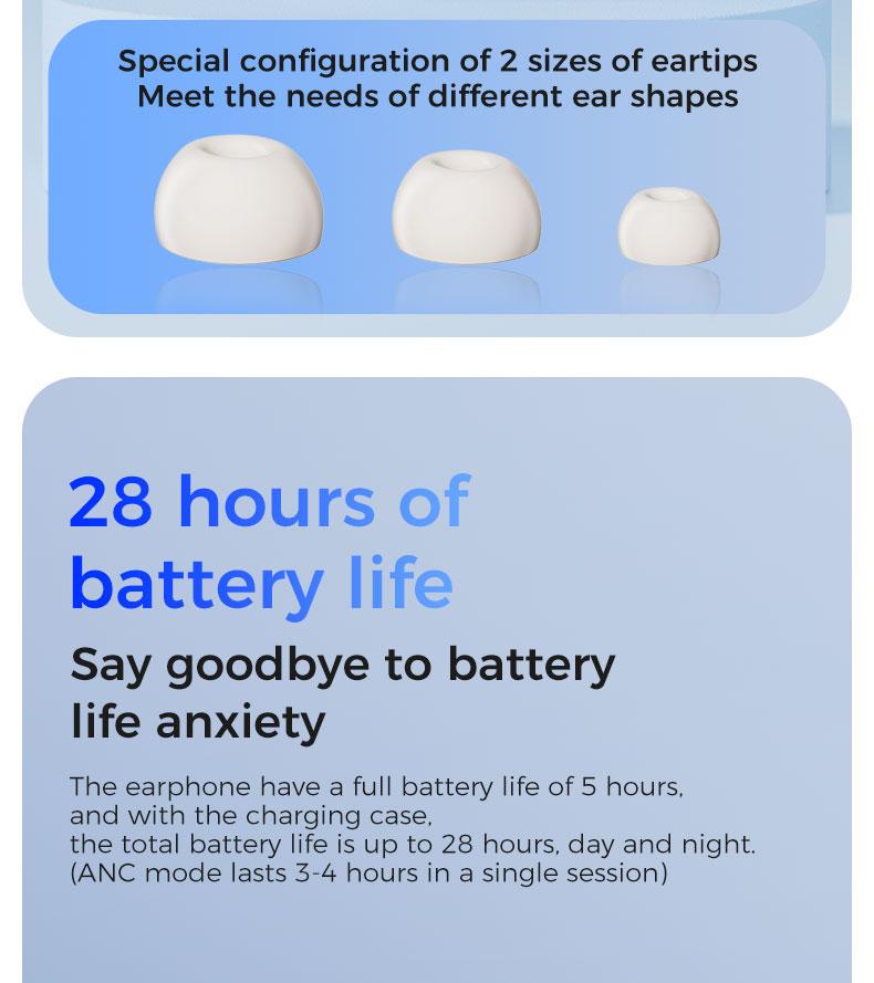 Thời lượng pin 28 giờ với hộp sạc, thời gian chơi 5 giờ với một lần sạc;