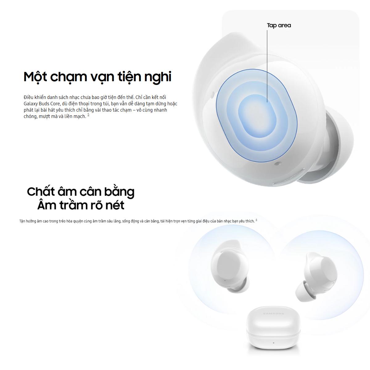 Bên cạnh đó, Galaxy Buds Core R410N còn hỗ trợ điều khiển cảm ứng chạm, cho phép bạn thao tác dễ dàng chỉ với vài cú chạm nhẹ trên bề mặt tai nghe. Thiết kế cảm ứng nhạy bén, phản hồi tức thì giúp việc sử dụng trở nên tự nhiên và tiện lợi hơn, mang đến trải nghiệm nghe hiện đại, linh hoạt và đầy tinh tế.