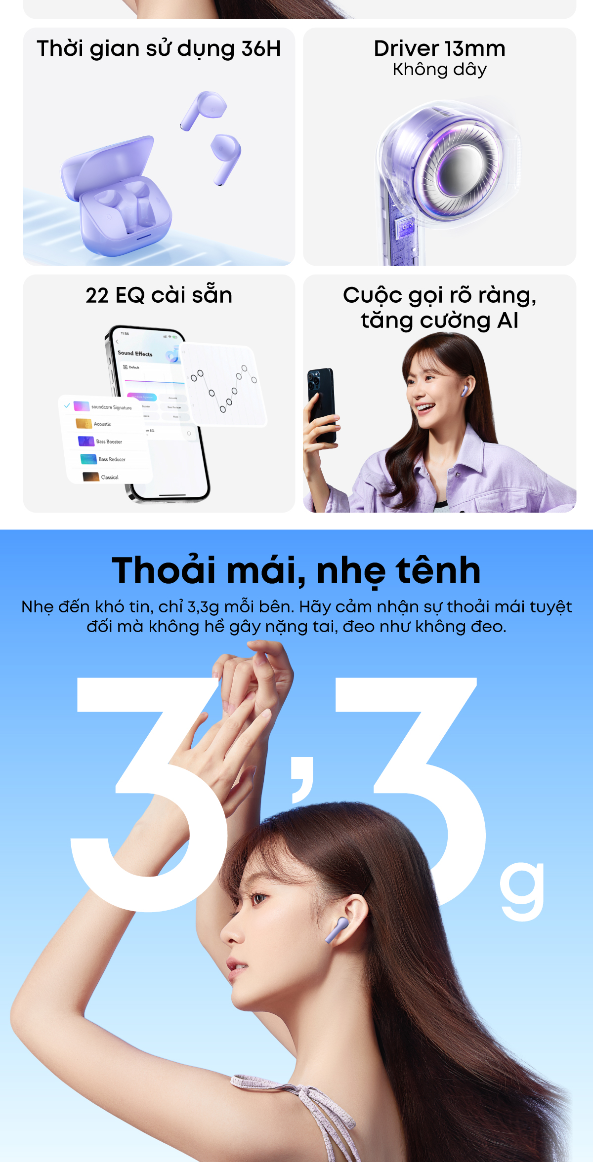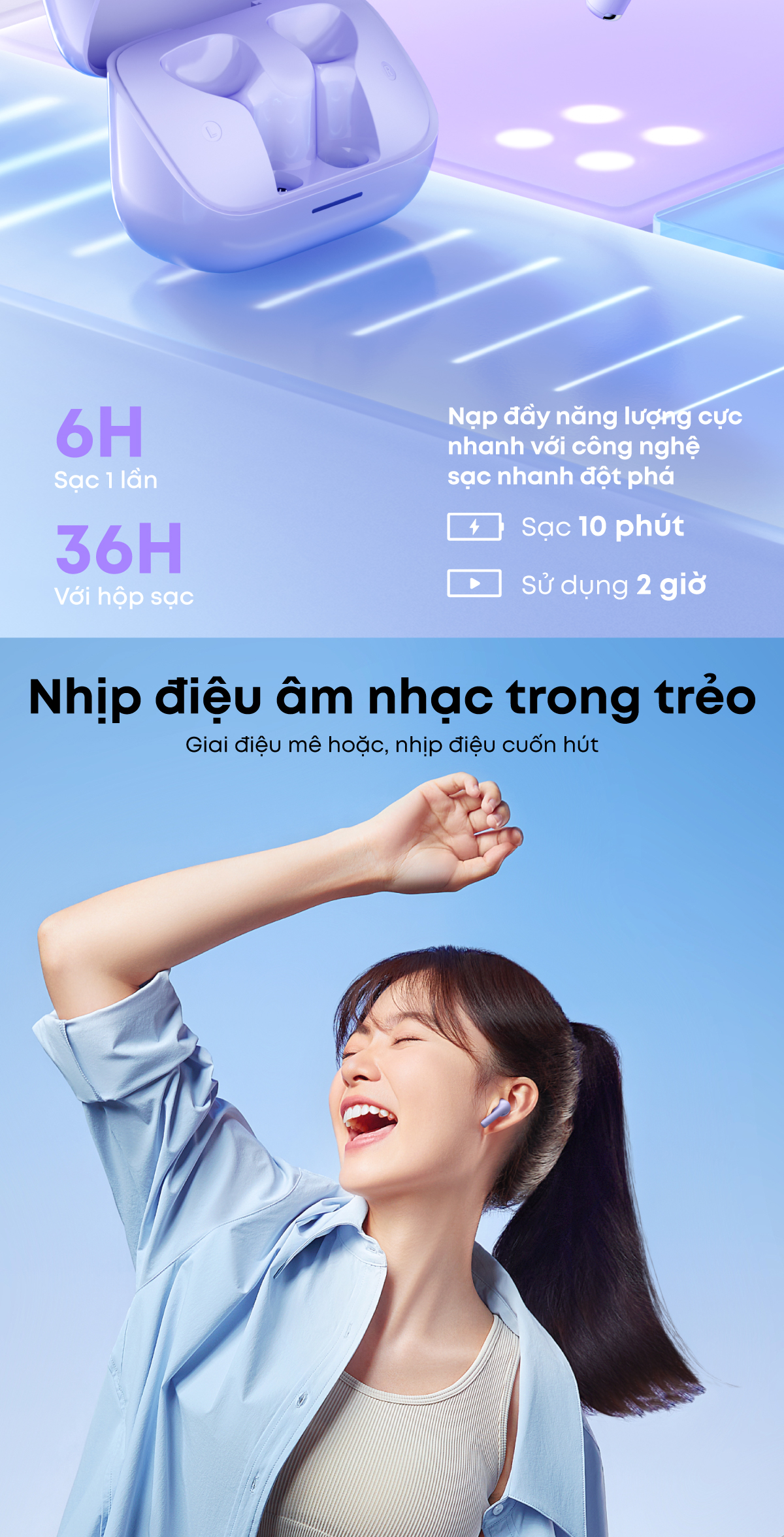 Thời gian nghe: lên đến 6 giờ (tai nghe) / 36 giờ (hộp sạc)