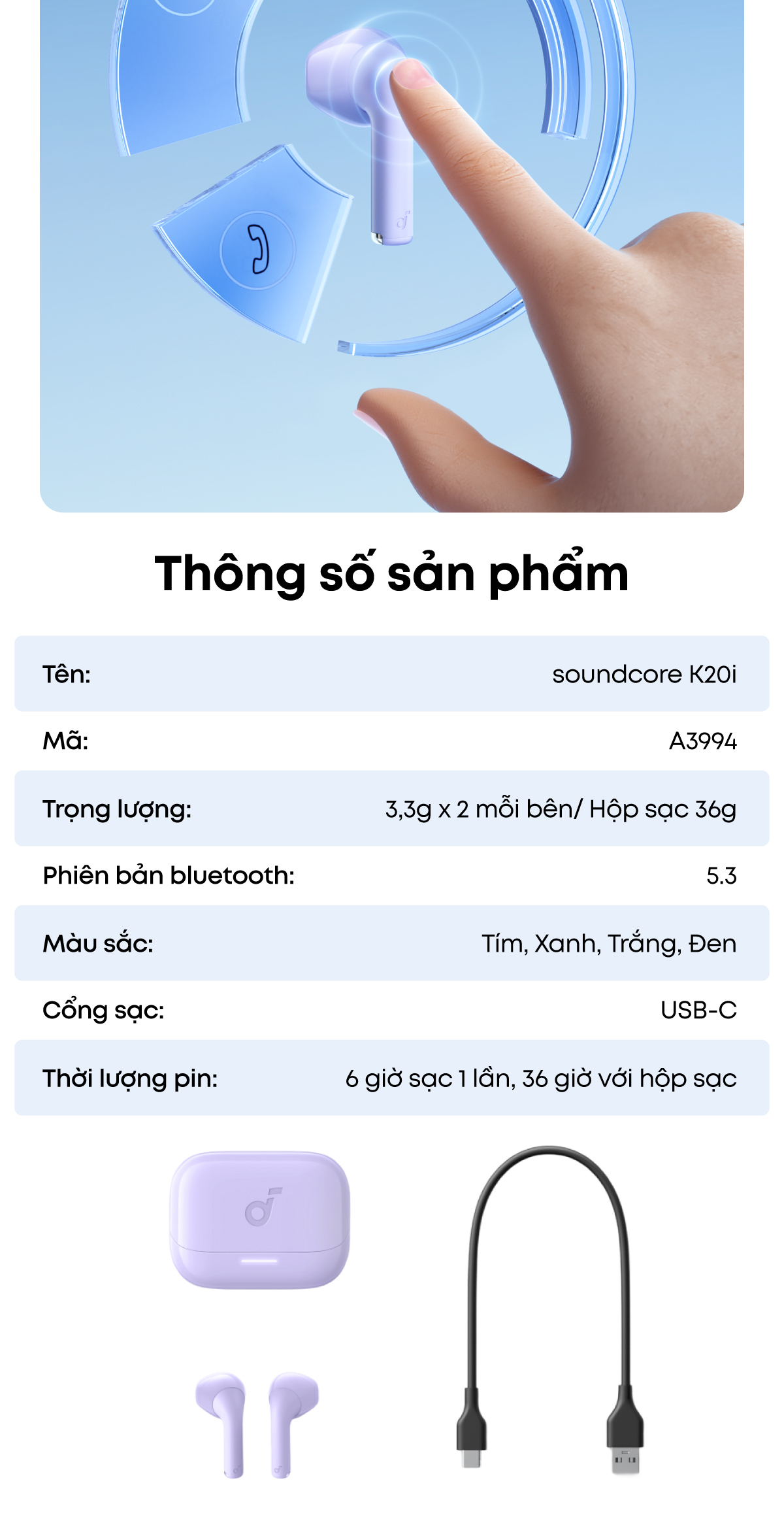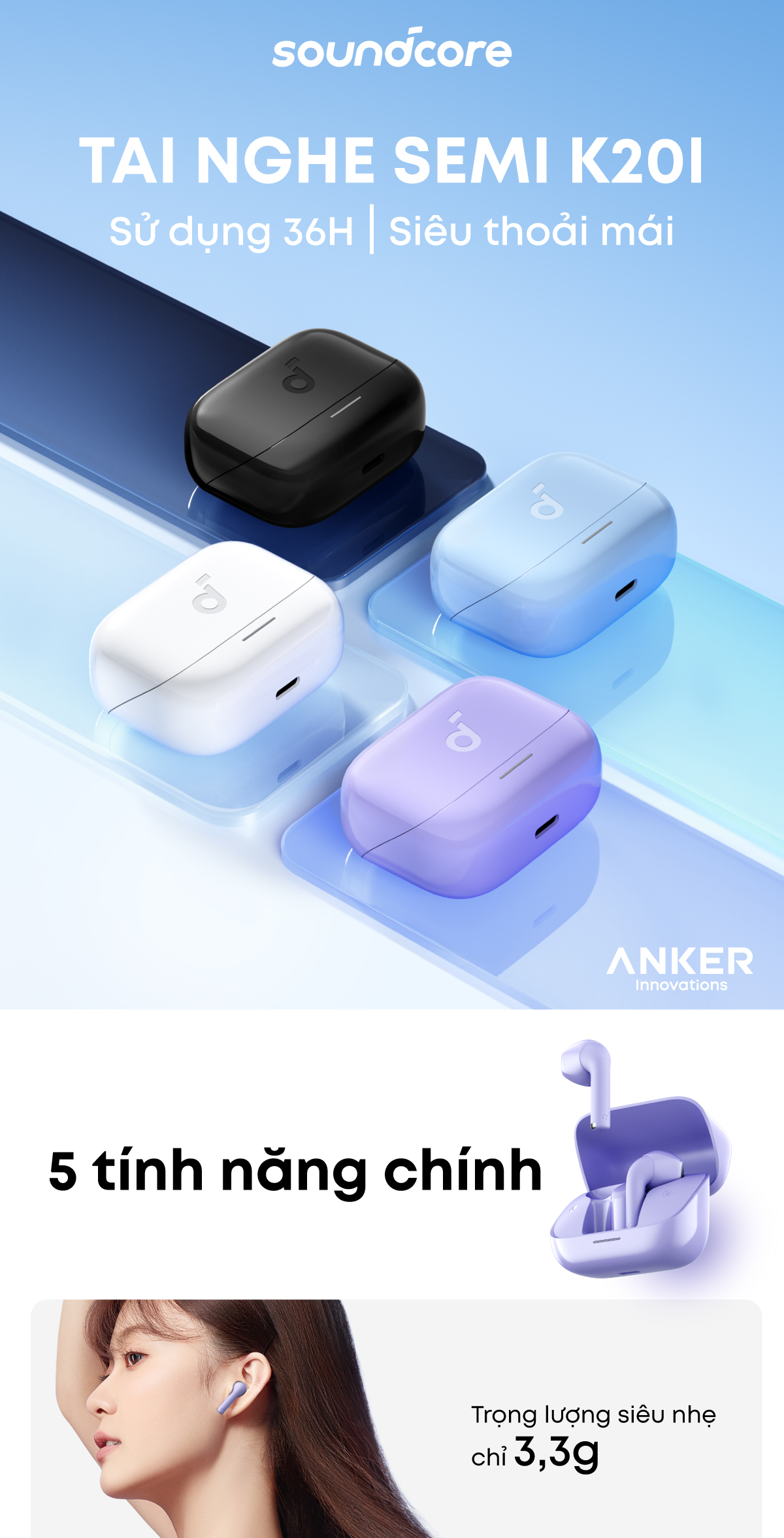 Tai nghe bluetooth Semi In-Ear soundcore K20i | Siêu gọn nhẹ | Chống nước IPX5 | Tích hợp phiên dịch