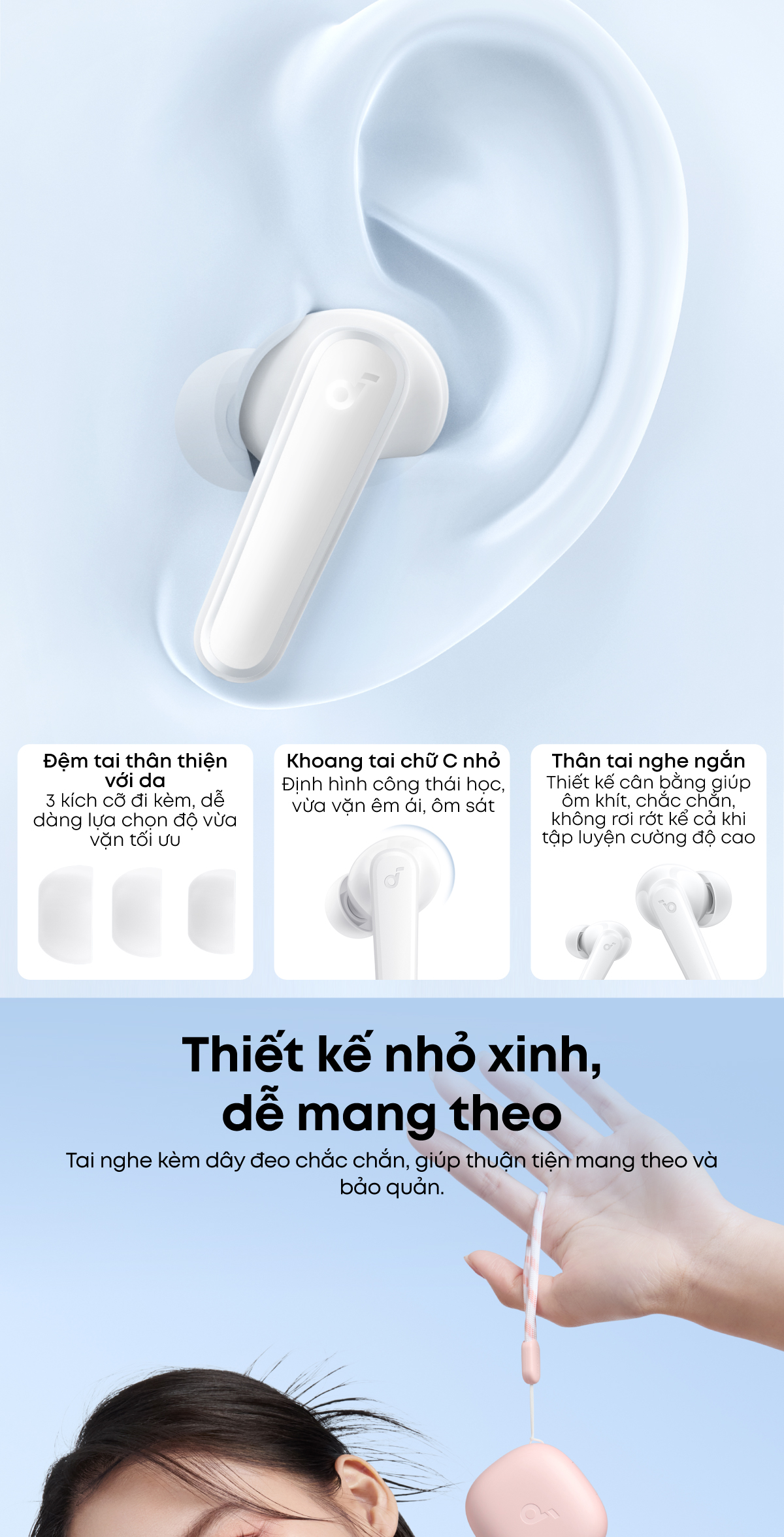 - Thiết kế nhỏ gọn kèm dây đeo tiện lợi.