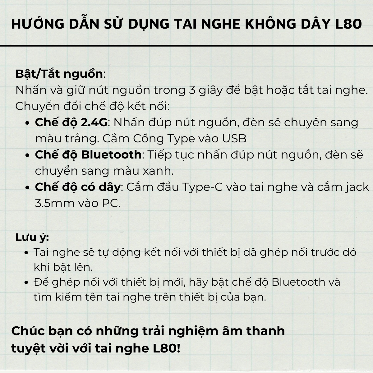 Kết nối: 3 chế độ - Bluetooth 5.3, không dây 2.4GHz (độ trễ 20ms), jack 3.5mm