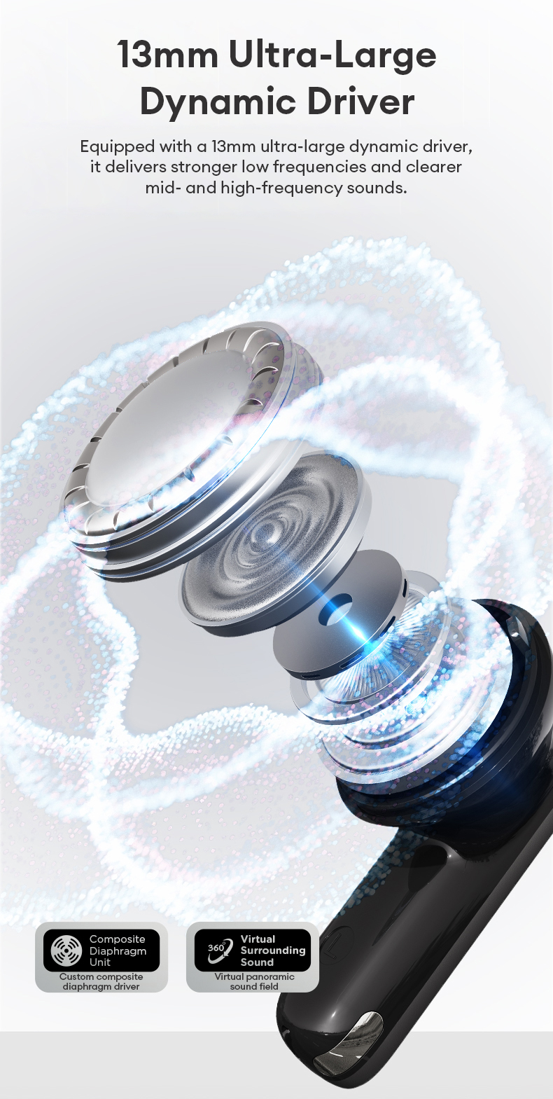 Chất lượng âm thanh vượt trội: Được trang bị bộ trình điều khiển lớn 13,0mm cho trải nghiệm âm thanh rõ ràng và mạnh mẽ.
