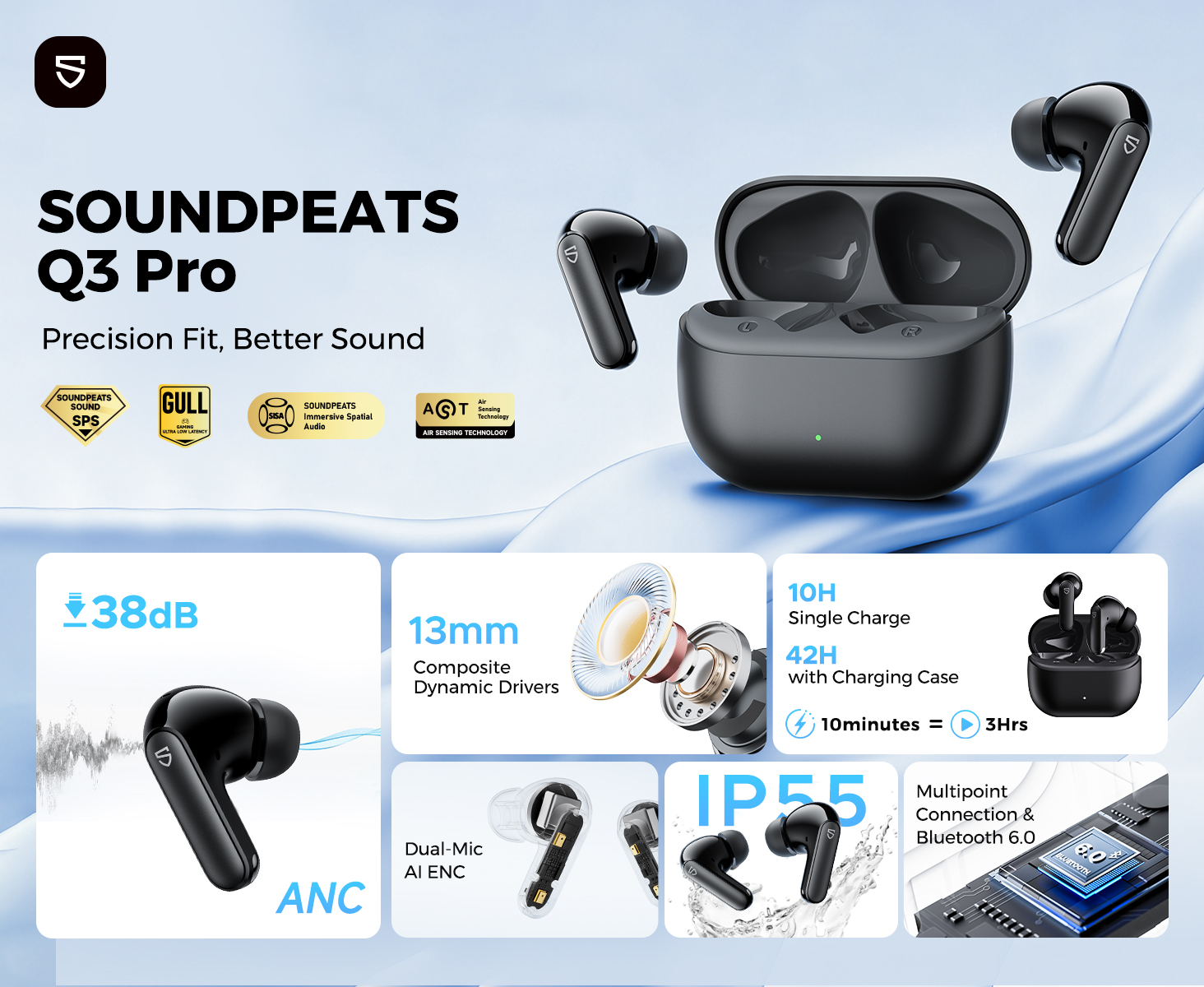 Tai nghe không dây SoundPEATS Q3 Pro Bluetooth 6.0 Dual Mics ANC Chế độ chơi game Hỗ trợ ứng dụng