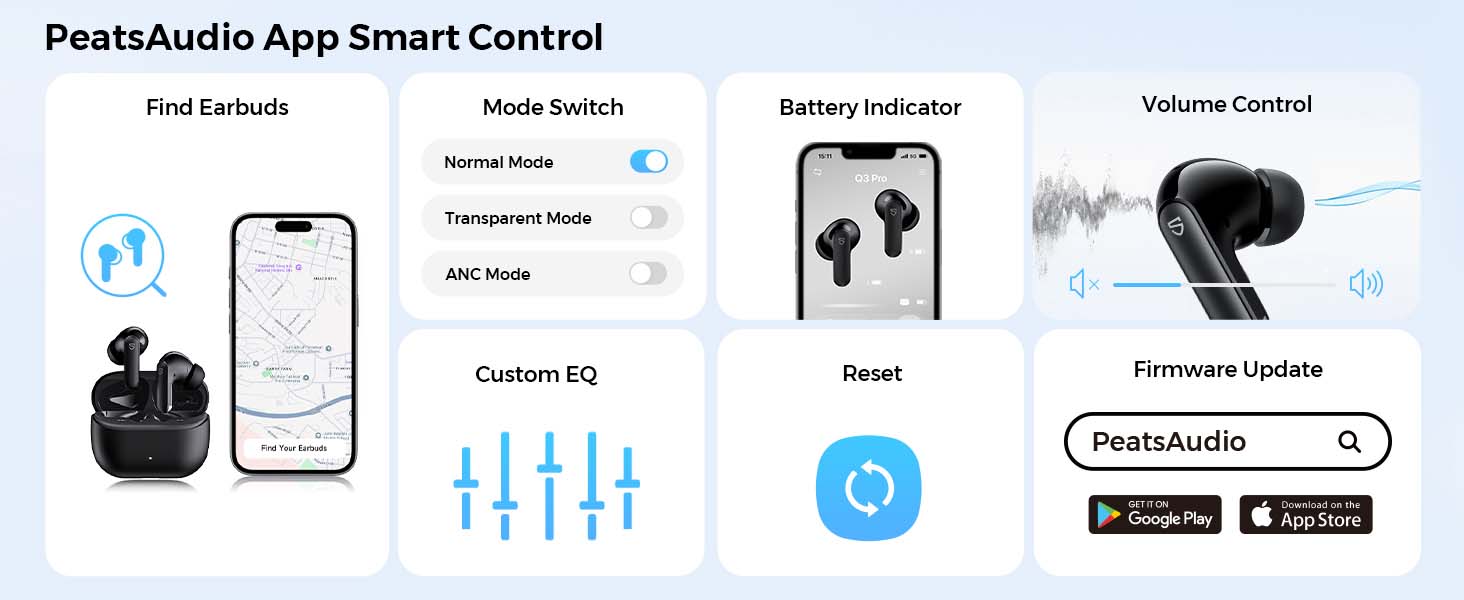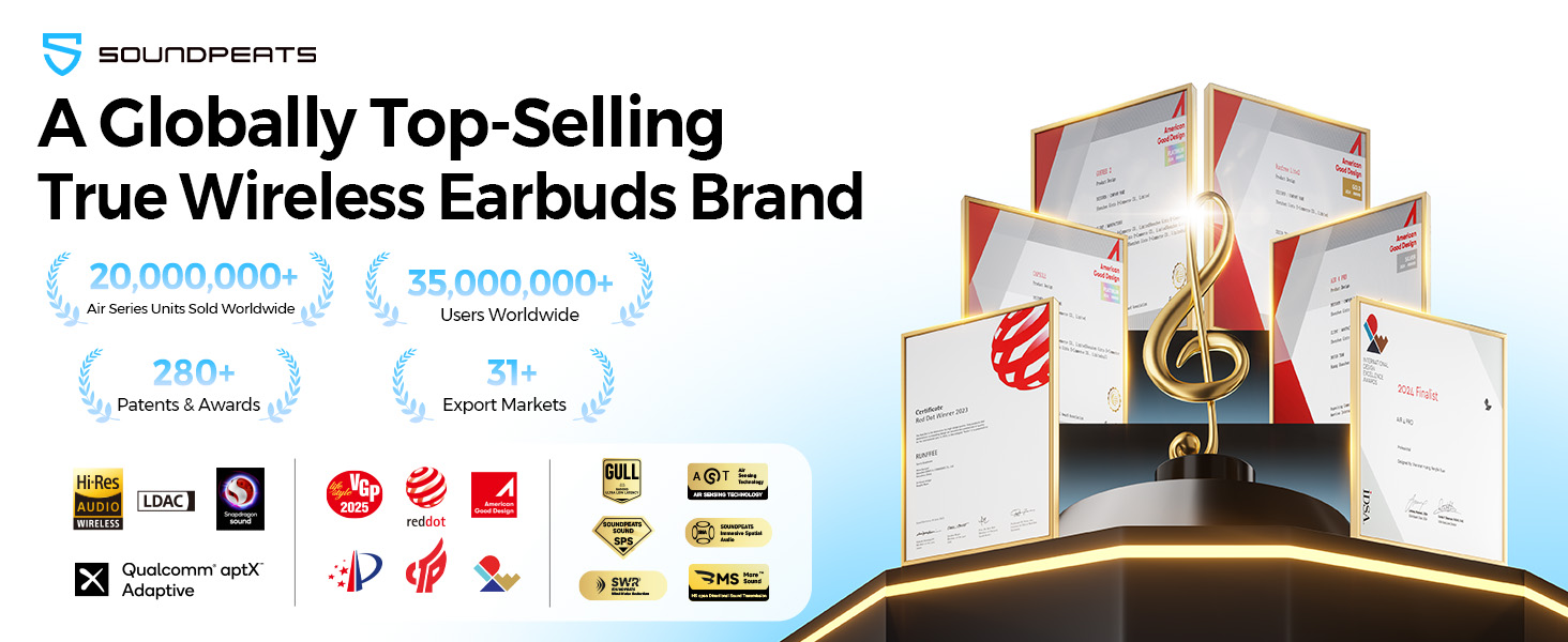 4.Phòng thí nghiệm âm thanh SPS Chứng nhận nhãn vàng nhỏ, ỨNG DỤNG SOUNDPEATS (một-hai, điều chỉnh EQ, màn hình nguồn tai nghe hộp sạc...)