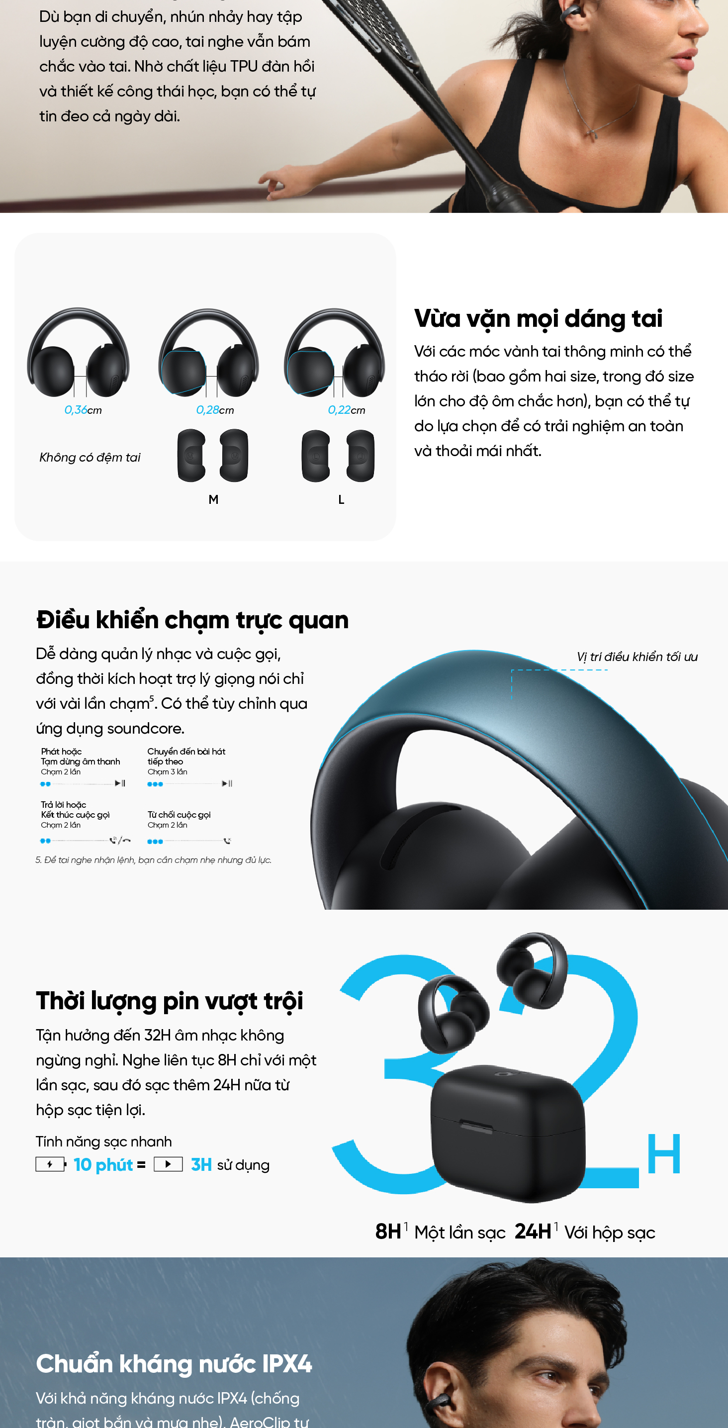 - Với các móc vành tai thông minh có thể tháo rời (bao gồm hai size, trong đó size lớn cho độ ôm chắc hơn), bạn có thể tự do lựa chọn để có trải nghiệm an toàn và thoải mái nhất.