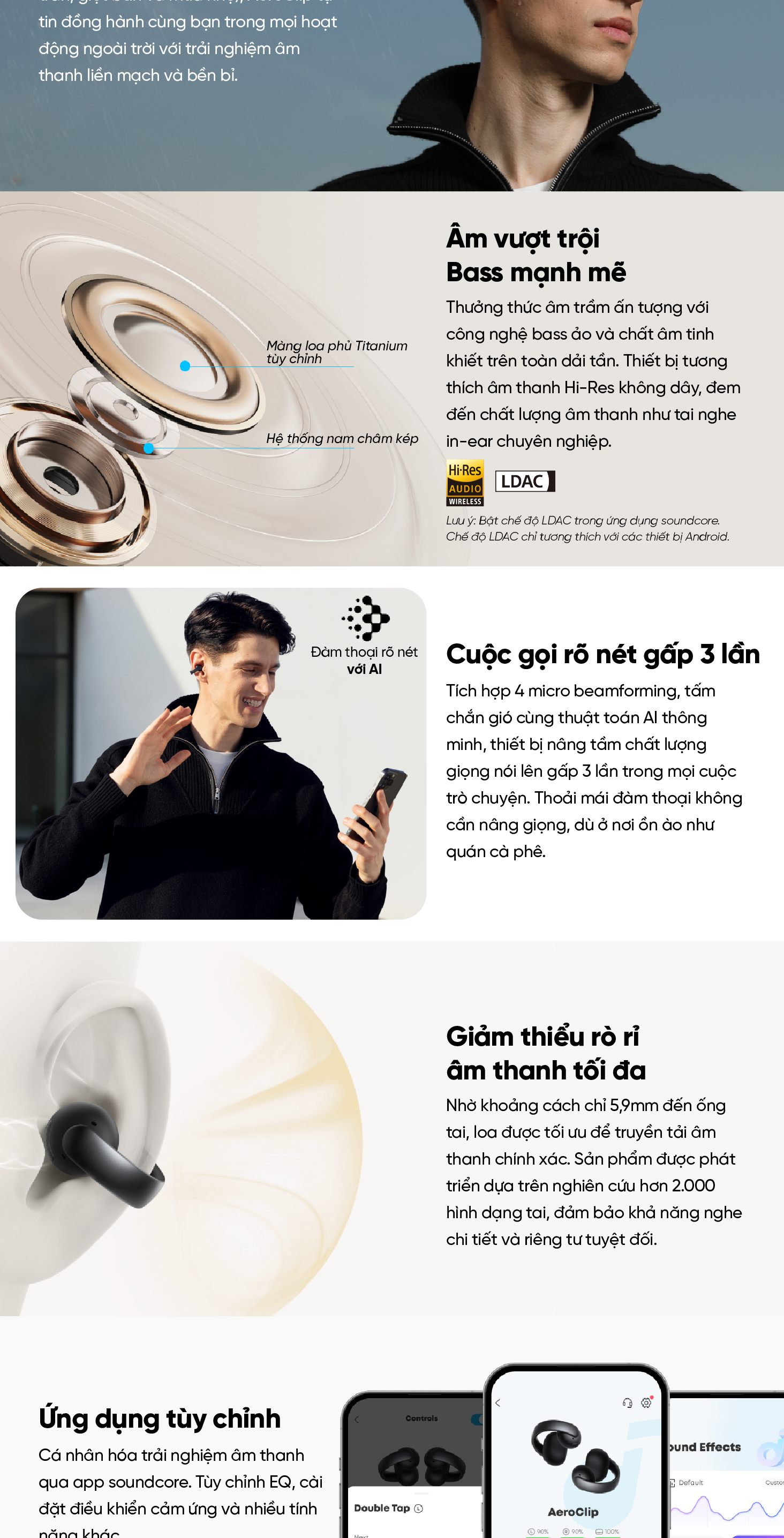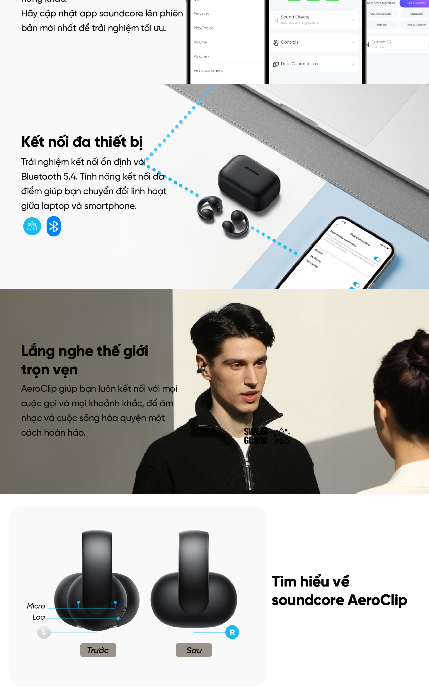 - Với khả năng kháng nước IPX4 (chống tràn, giọt bắn và mưa nhẹ), AeroClip tự tin đồng hành cùng bạn trong mọi hoạt động ngoài trời với trải nghiệm âm thanh liền mạch và bền bỉ.
