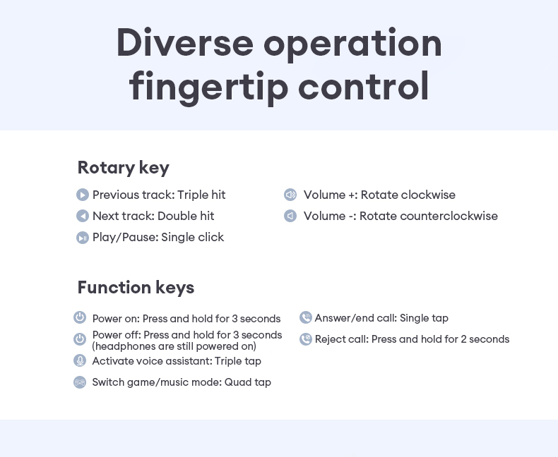 Nhấn và giữ nút nguồn để bật và vào chế độ ghép nối. Kết nối qua Bluetooth "Lenovo LS102". Sử dụng phím xoay để điều khiển âm lượng và theo dõi. Sử dụng các phím chức năng cho cuộc gọi, trợ lý giọng nói và chuyển đổi giữa các chế độ Trò chơi / Âm nhạc.