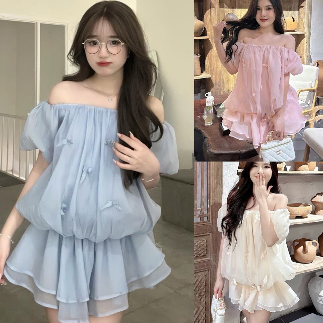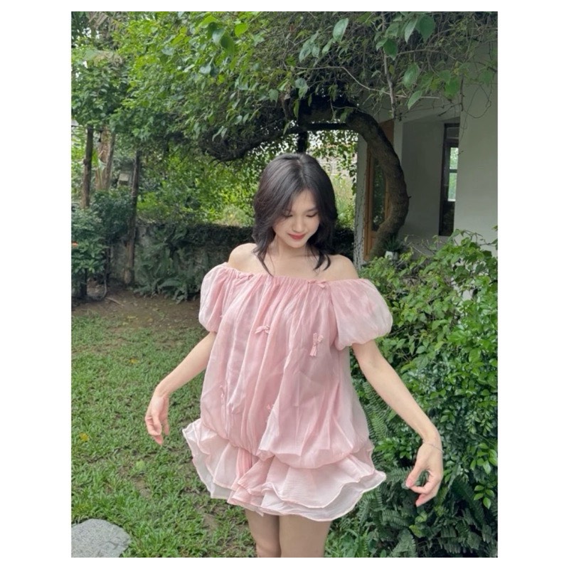 váy trễ vai voan tơ quả bí đính nơ bồng bềnh tiểu thư bánh bèo 2 lớp A738 SUTANO sẵn hàng với 1 thiết kế áo tiểu thư bánh bèo