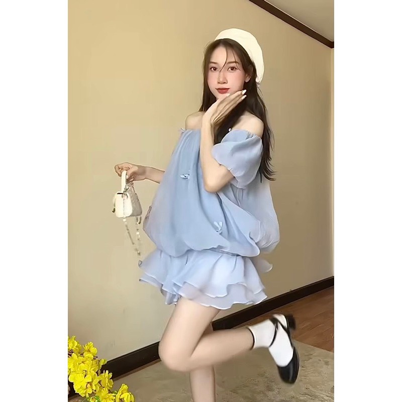 [TẶNG KÈM QUẦN] áo trễ vai voan tơ quả bí đính nơ bồng bềnh tiểu thư bánh bèo 2 lớp A738 SUTANO