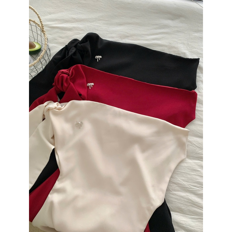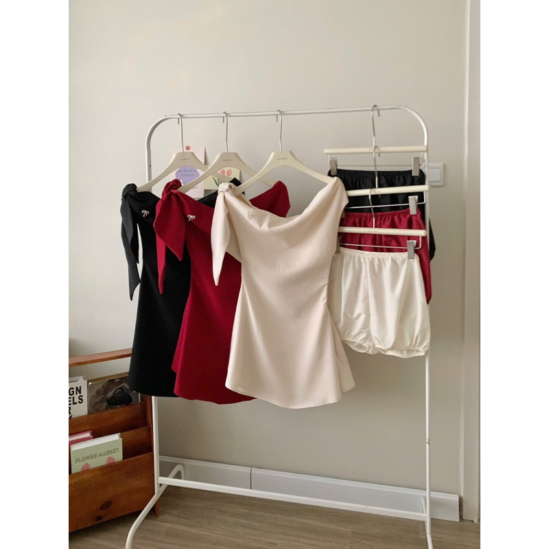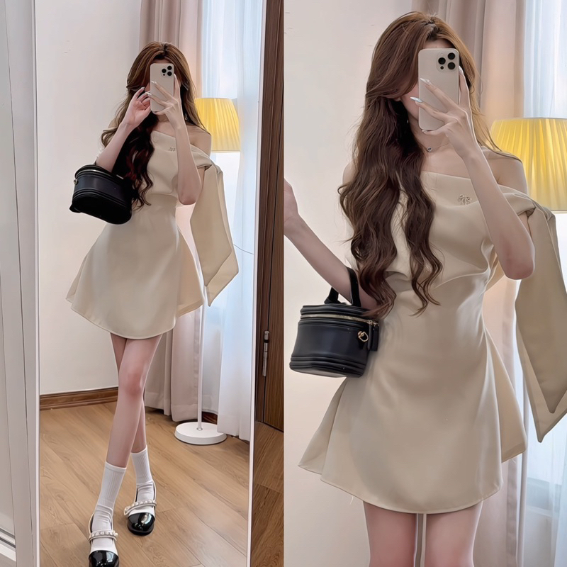 [Tặng nơ đá] Đầm trễ vai tiểu thư chiết ly eo buộc nơ vai sang chảnh dự tiệc HV280