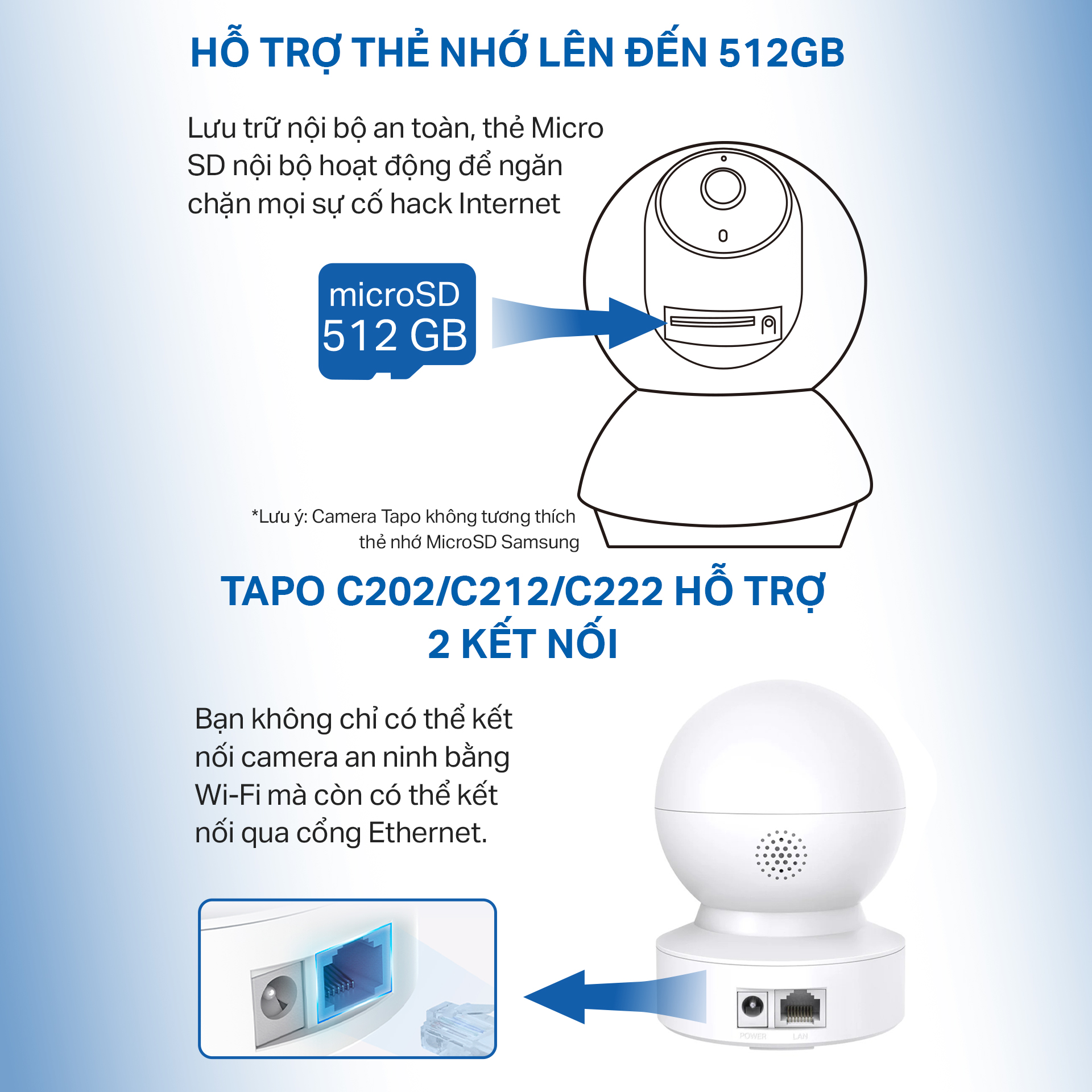 - TAPO C212 - Độ phân giải 3MP 2K UHD, hỗ trợ cổng LAN và WiFi