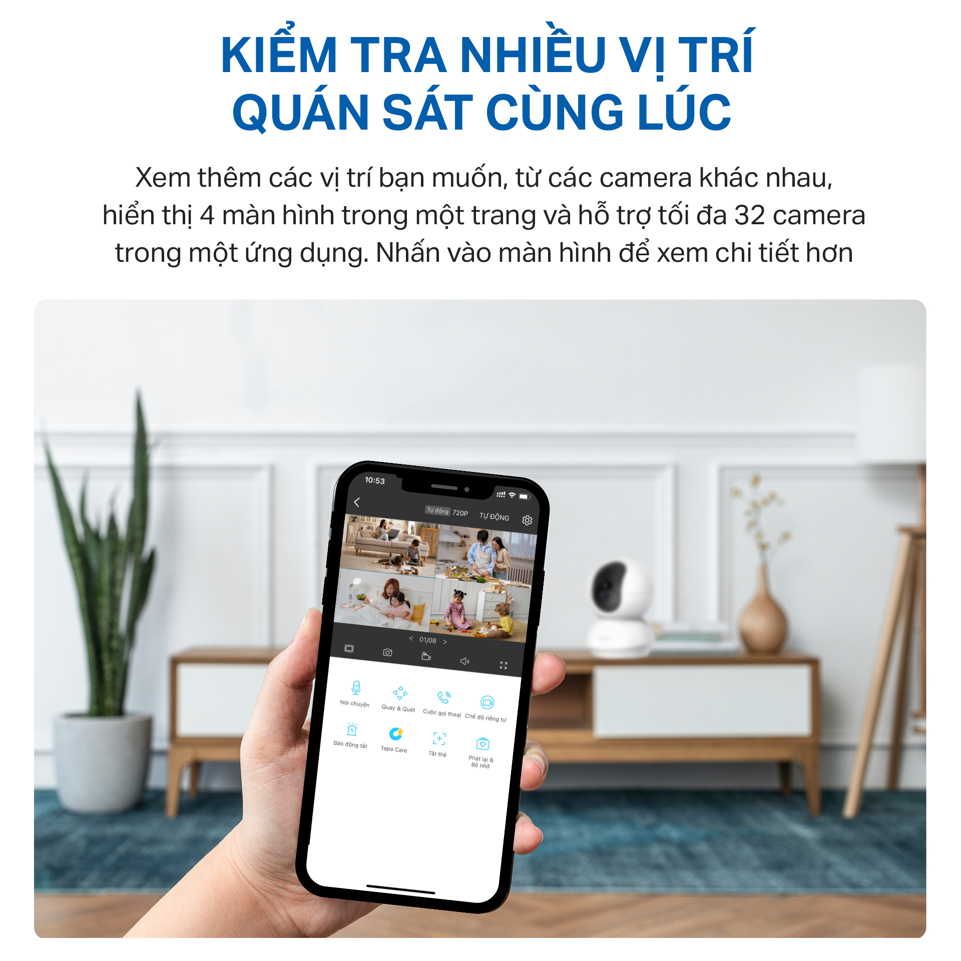 - Kiểm tra nhiều vị trí quan sát cùng một lúc: Xem thêm các vị trí bạn muốn, từ các camera khác nhau, hiển thị 4 màn hình trong một trang và hỗ trợ tối đa 32 camera trong một ứng dụng. Nhấn vào một màn hình để xem chi tiết hơn