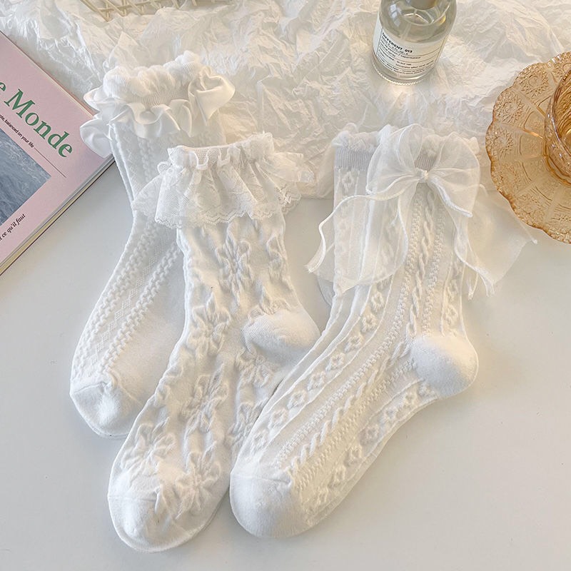 Tất vớ cao cổ nữ phối ren đính nơ Jengiang cotton co giãn thoáng khí phong cách nữ sinh lolita y2k Nhật Bản ZT650
