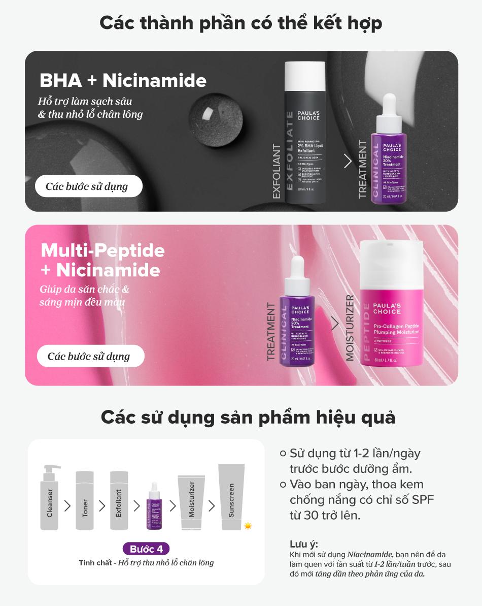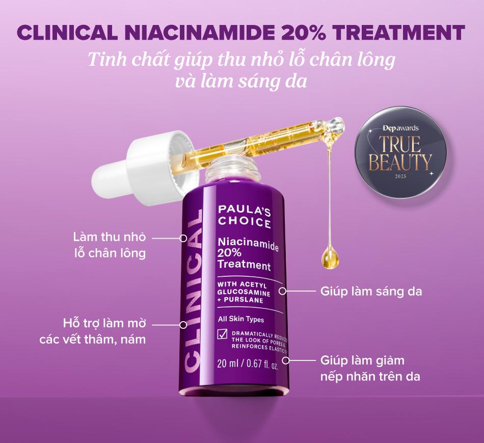 Tinh chất Clinical Niacinamide 20% Treatment chứa nồng độ 20% Niacinamide (vitamin B3) có tác dụng cải thiện tình trạng lỗ chân lông to, khắc phục bề mặt da kém mềm mịn do tuổi tác hoặc do ánh nắng mặt trời gây ra.