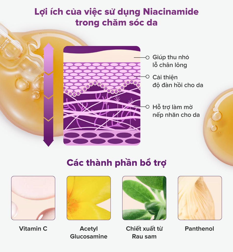 Niacinamide, Acetyl Glucosamine, Chiết xuất rau sam