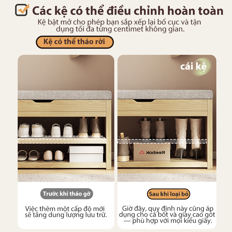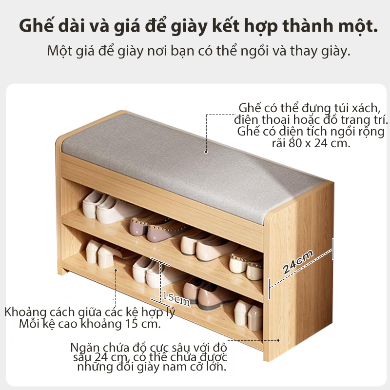 ✨ Thiết kế 2 trong 1: Sự kết hợp hoàn hảo giữa kệ để giày và ghế ngồi chờ, giúp việc thay giày trở nên thư giãn và thoải mái hơn.