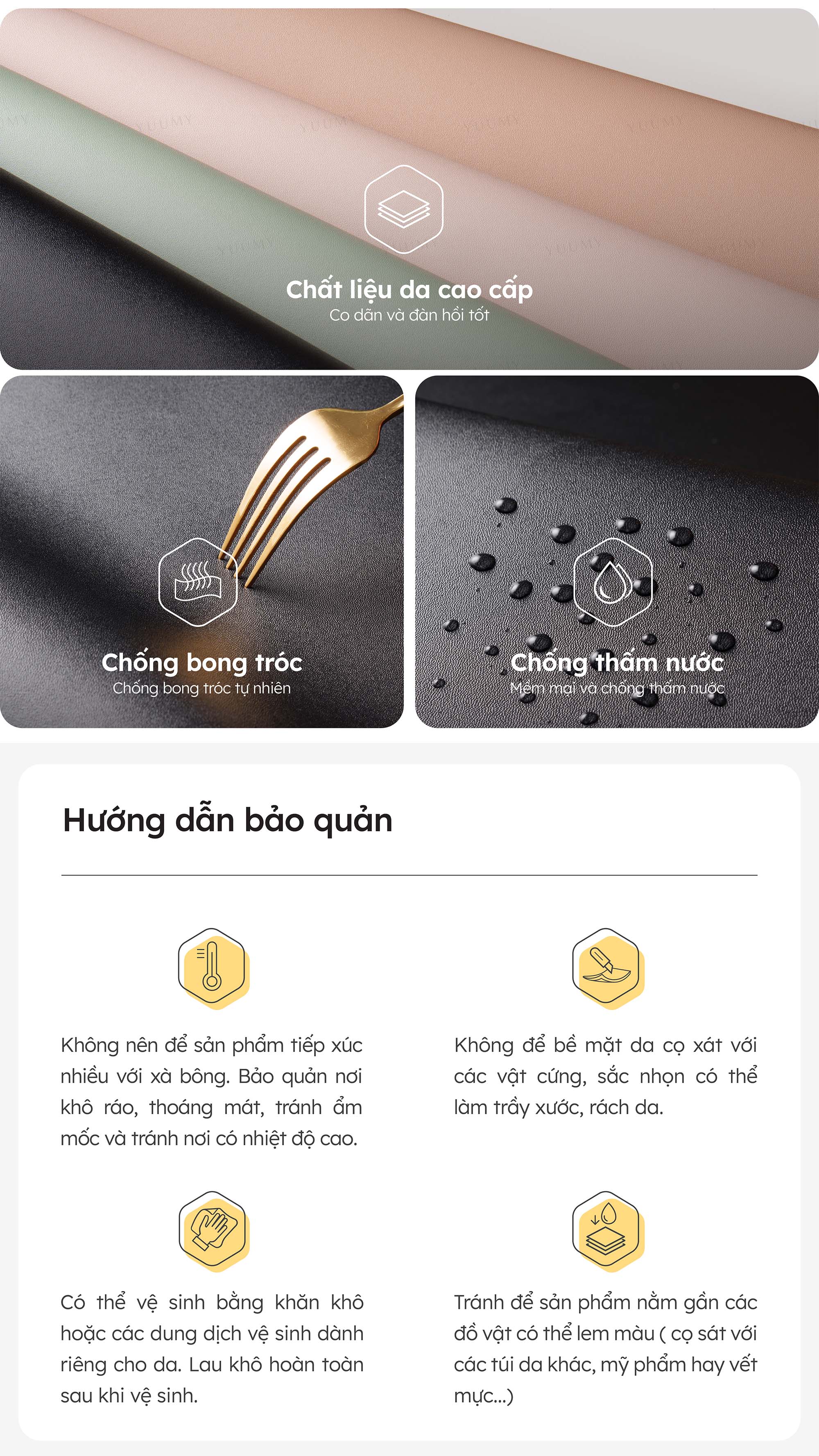 - Có thể vệ sinh bằng khăn khô hoặc các dung dịch vệ sinh dành riêng cho da