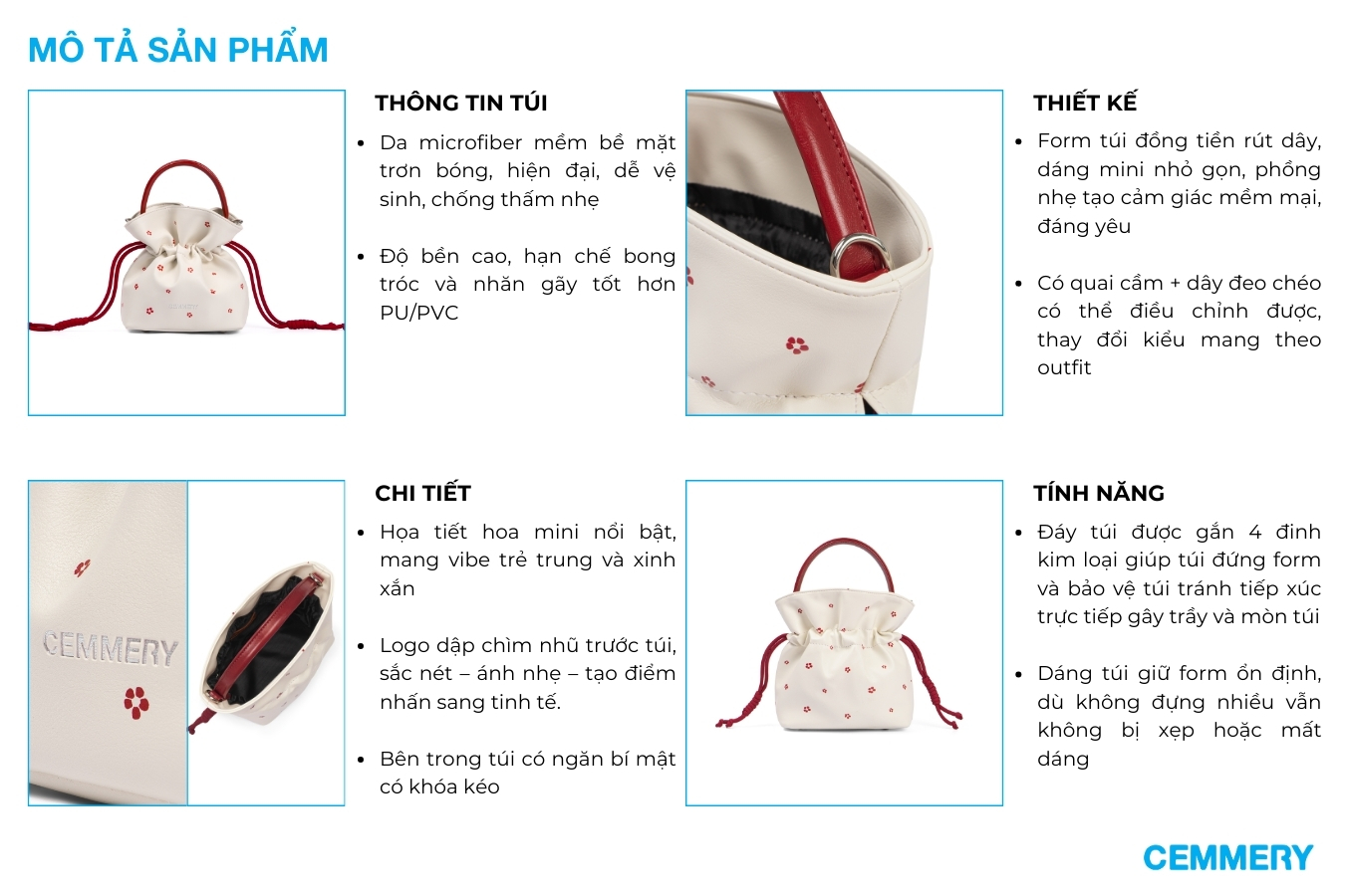 - Thiết kế: Logo CEMMERY dập chìm tinh tế, kết hợp dây rút chắc chắn để bảo vệ đồ dùng bên trong. Hoạ tiết cánh hoa in lụa nhỏ trải đều phần thân túi, đồng bộ cùng ví Bloom Wallet tạo thành bộ đôi đáng yêu.