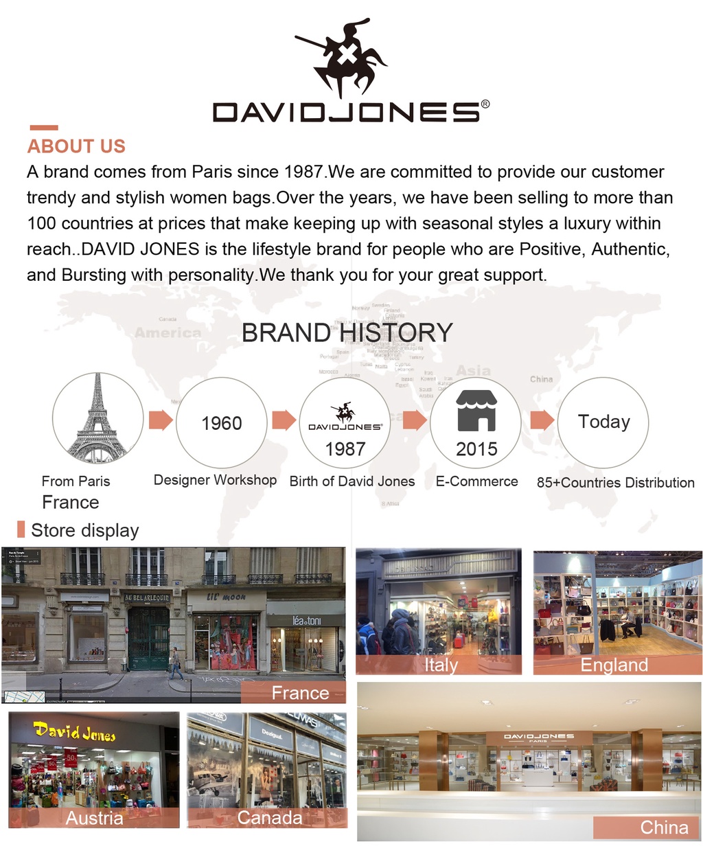 Davijones, một thương hiệu đến từ Paris từ năm 1987.Chúng tôi cam kết cung cấp cho khách hàng những chiếc túi nữ thời trang và sành điệu. Trong những năm qua, chúng tôi đã bán hàng tại hơn 100 quốc gia với giá cả phù hợp với phong cách theo mùa trở nên sang trọng trong tầm tay. Thương hiệu dành cho những người Tích cực, Xác thực và Bùng nổ với cá tính. Chúng tôi cảm ơn bạn đã hỗ trợ tuyệt vời của bạn.