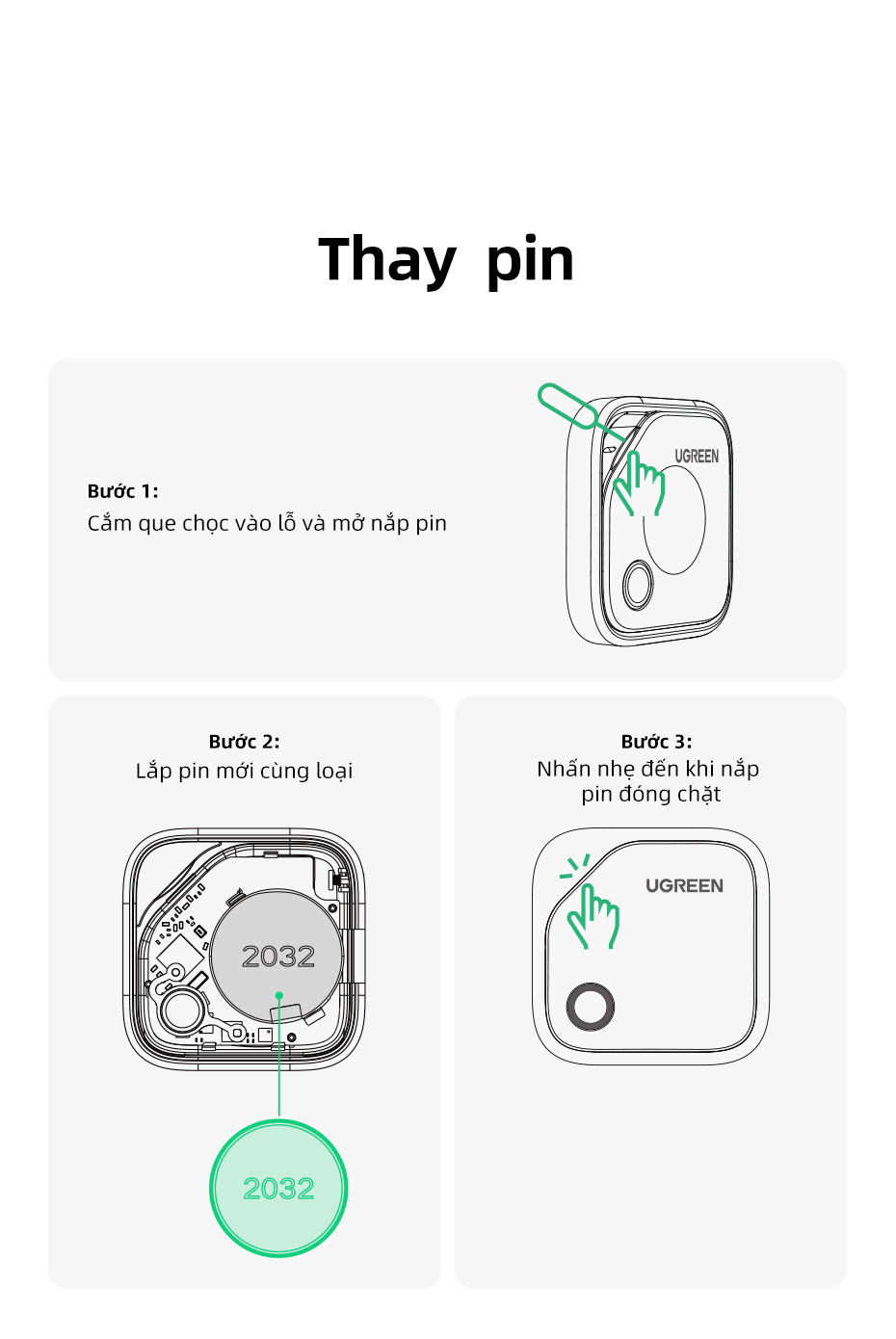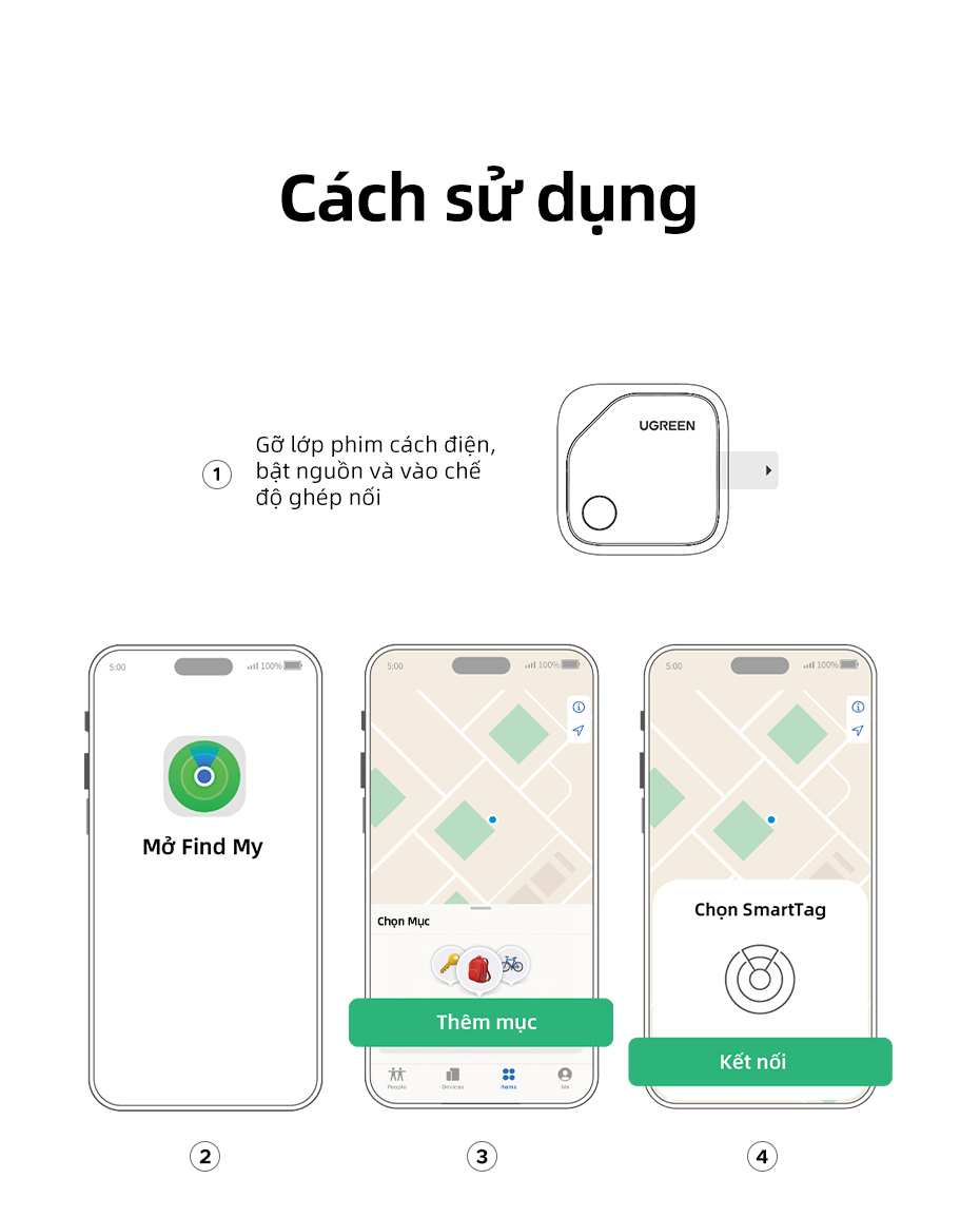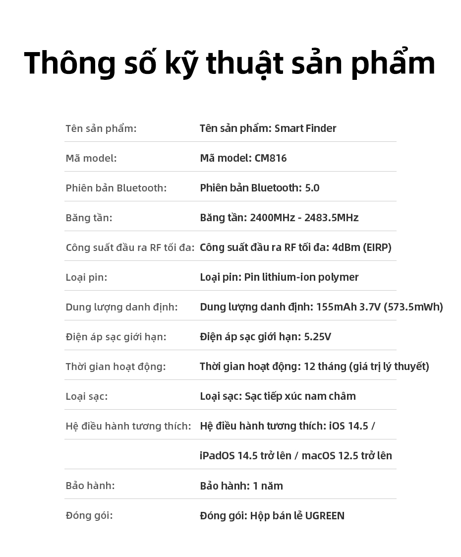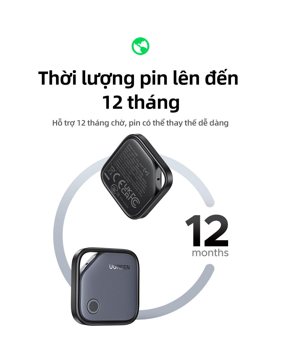 2.Tuổi thọ 2 năm, Pin có thể thay thế: Không giống như các sản phẩm khác có pin không thể thay thế hoặc tuổi thọ ngắn, thiết bị định vị UGREEN có chip công suất thấp tích hợp và pin cúc áo CR2032 có thể thay thế, có thể hoạt động lên đến 2 năm. Bạn có thể kiểm tra mức năng lượng bất cứ lúc nào thông qua ứng dụng Find My.
