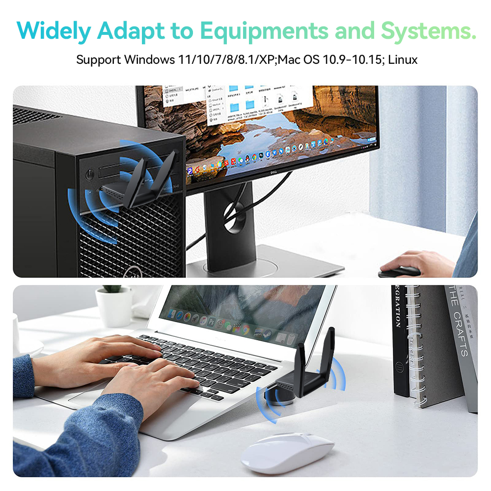 Hệ thống tương thích - Bộ chuyển đổi USB Wi-Fi này hỗ trợ Windows: 11/10/8.1/8/7/XP và Mac OS: 10.9-10.15. hệ thống Linux