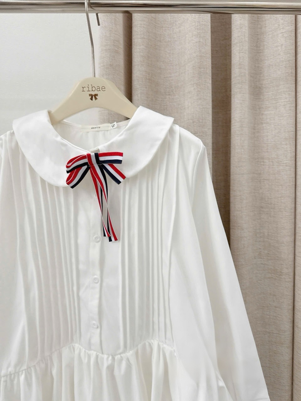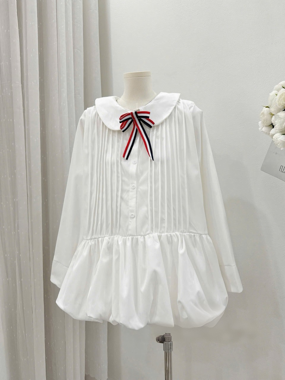 (V.03 Kèm Gấu-Nơ Thome); Váy Sơ Mi Trắng Cổ Sen Xếp Ly Ngực Dáng Babydoll Kèm Phụ Kiện Có Bảo Hộ Rời Vibe -Lollaye