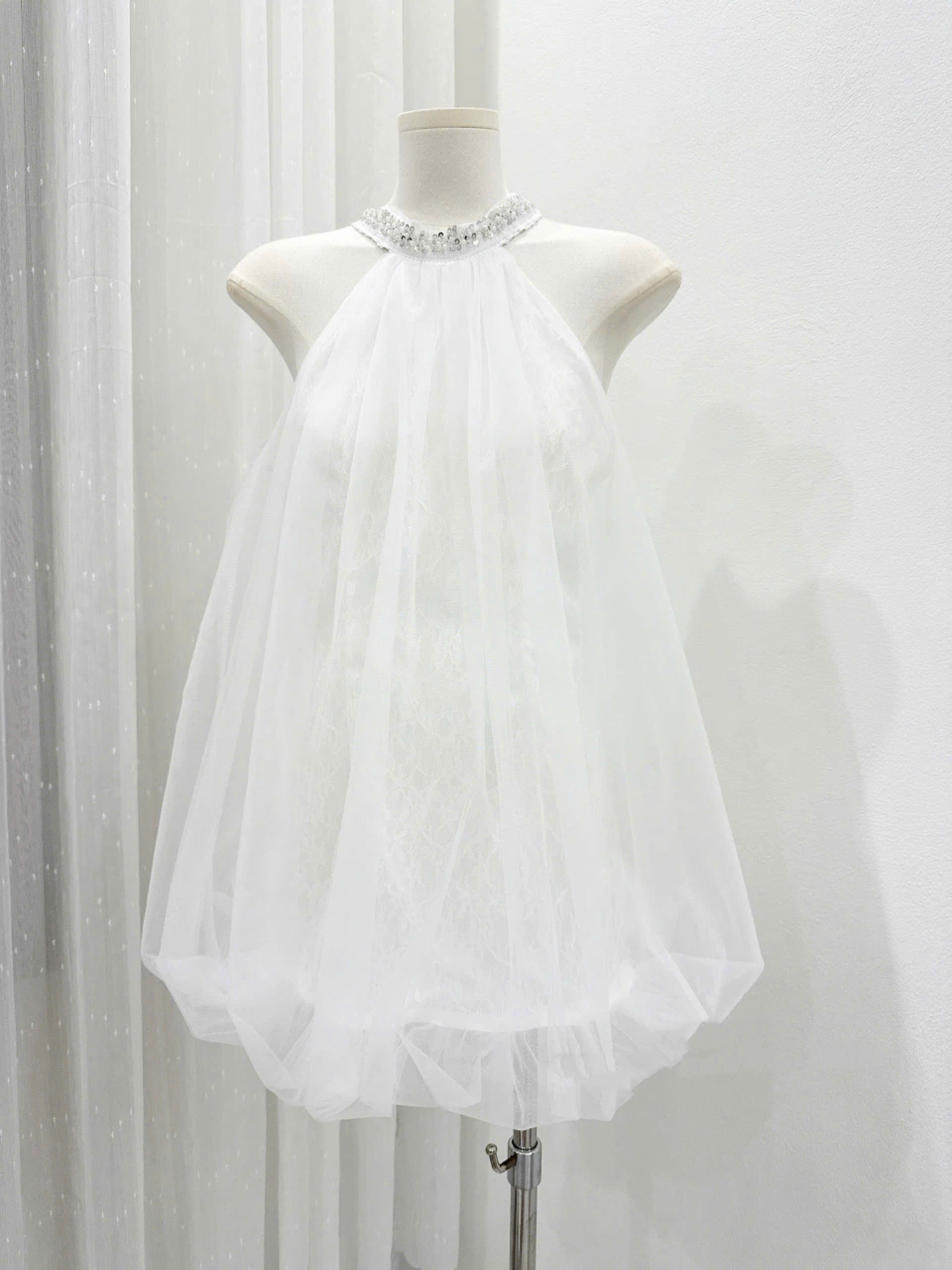 Tk ren ôm bên trong lớp bồng lưới bên ngoài. Cổ đá thêu dệt.