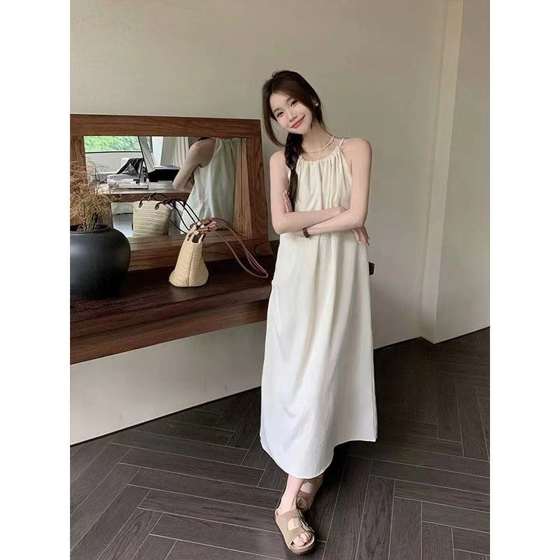 Váy 2 dây trễ vai đi biển Đầm hai dây dài bigsize nữ Trắng Đầm Sling Mùa Hè Rời Dài