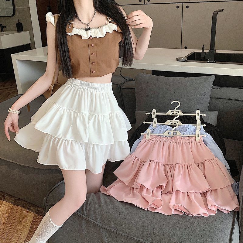 Váy bánh ngắn ba tầng diềm xếp nếp Thắt lưng co giãn Có lót, vải dù váy ngắn cao cấp dễ thương phù hợp với dáng người nhỏ nhắn