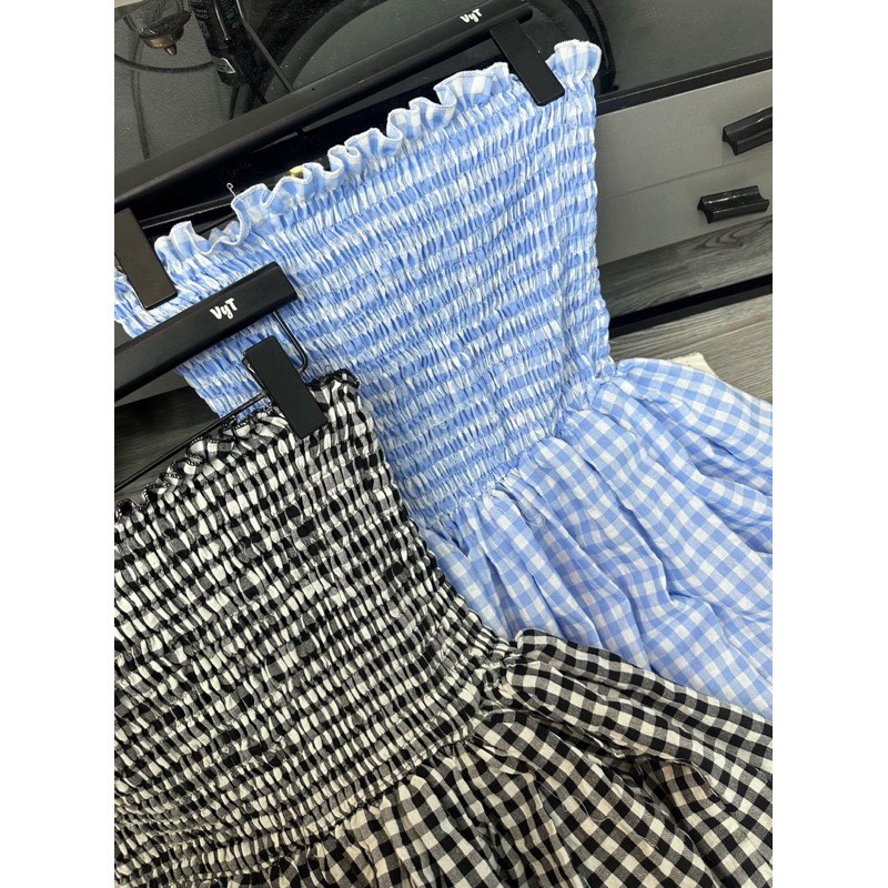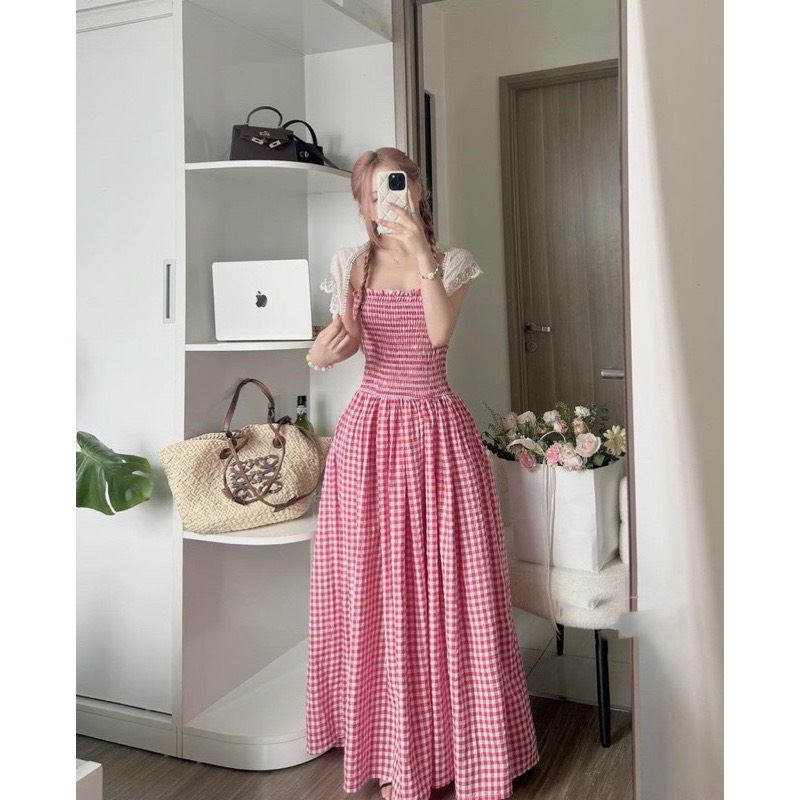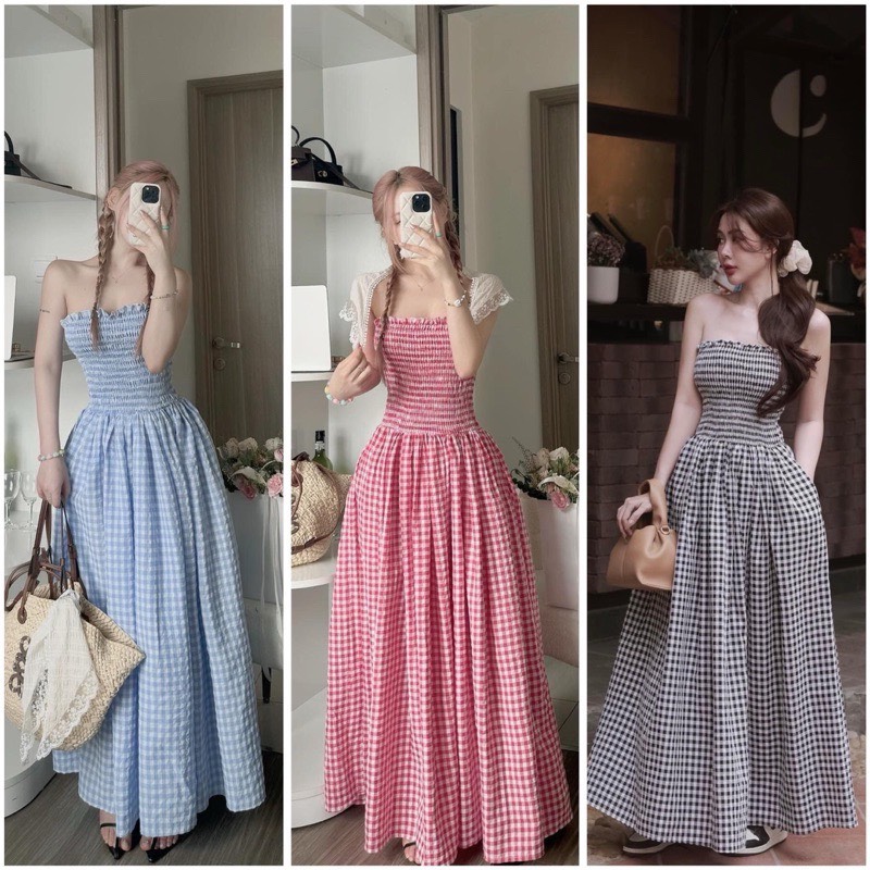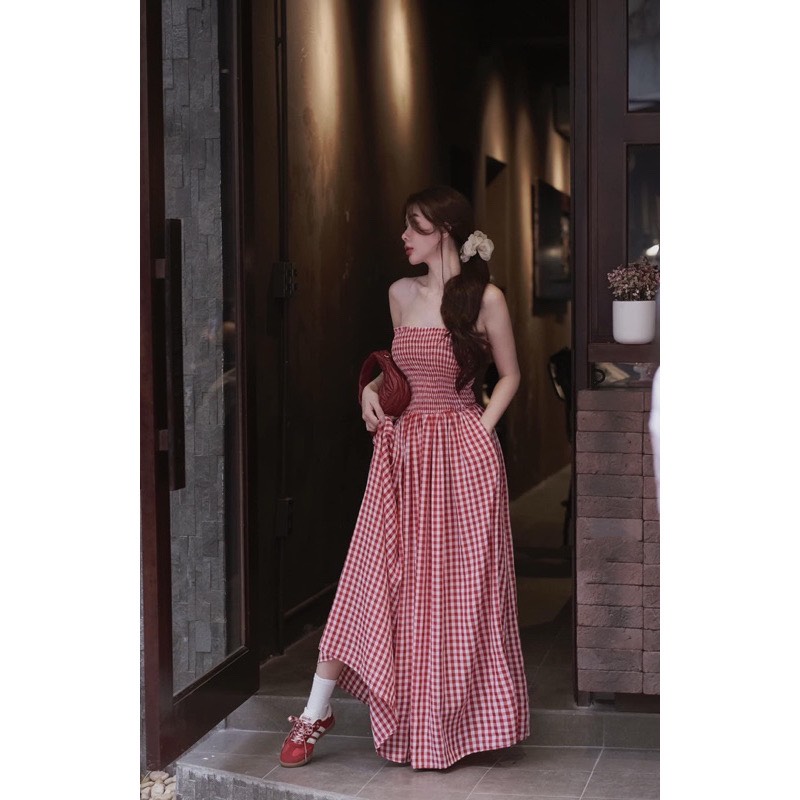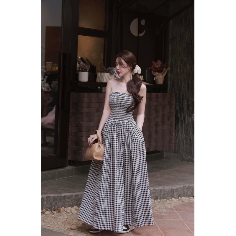 Váy Maxi cúp ngực bo chun chất kẻ thô có túi hông, váy kẻ caro mặc đi biển đi du lịch đi cafe dễ thương HV567