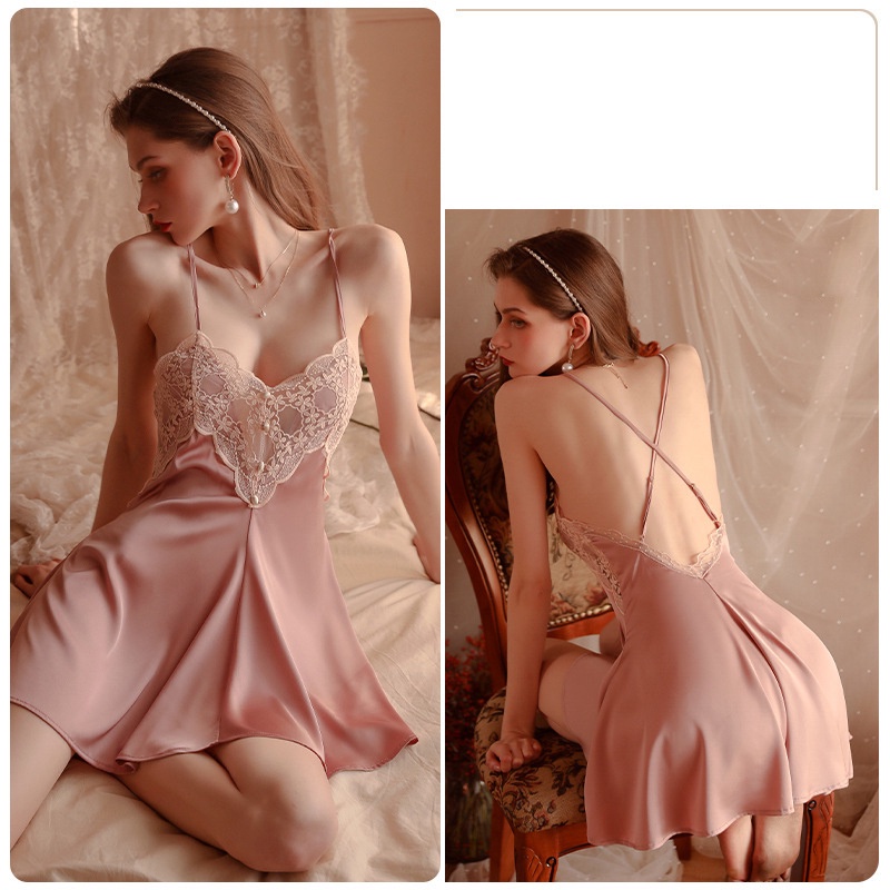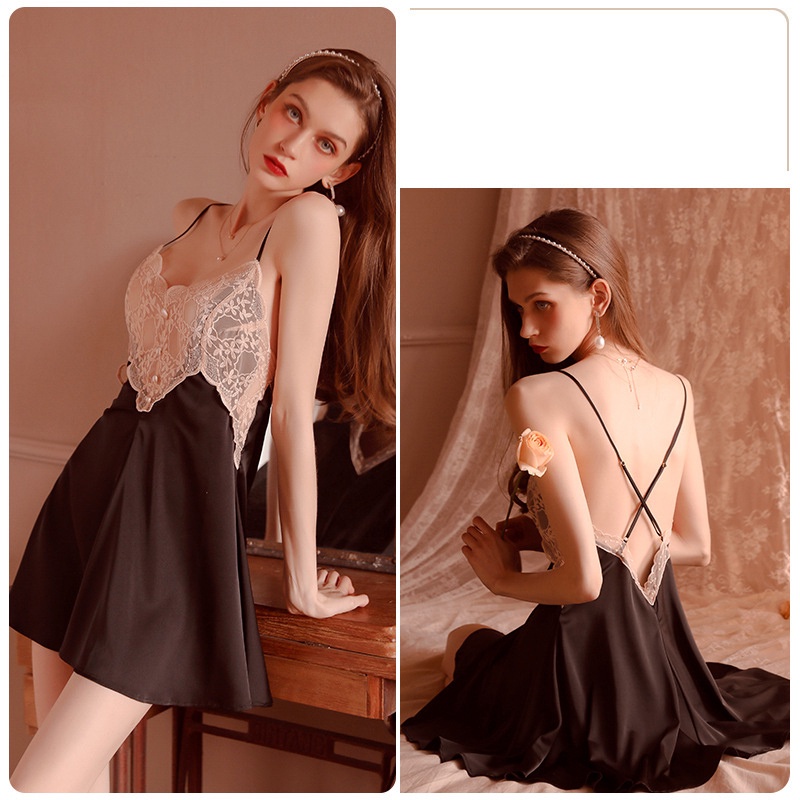 Váy ngủ lụa sexy phối ren hoa gợi cảm tinh tế đầm thức 2 dây chéo lưng tặng chip quyến rũ sang trọng BIKI HOUSE N136