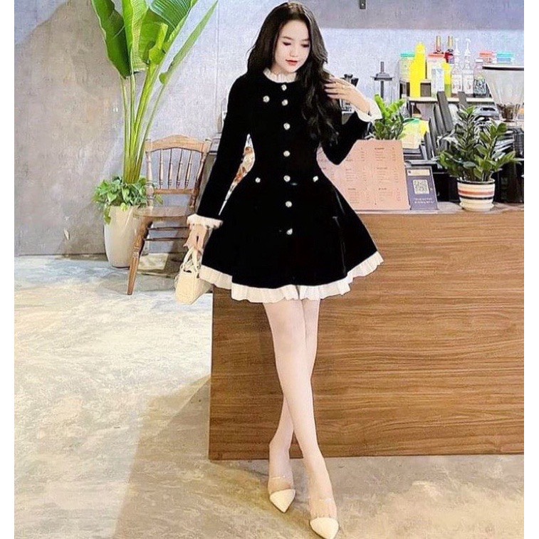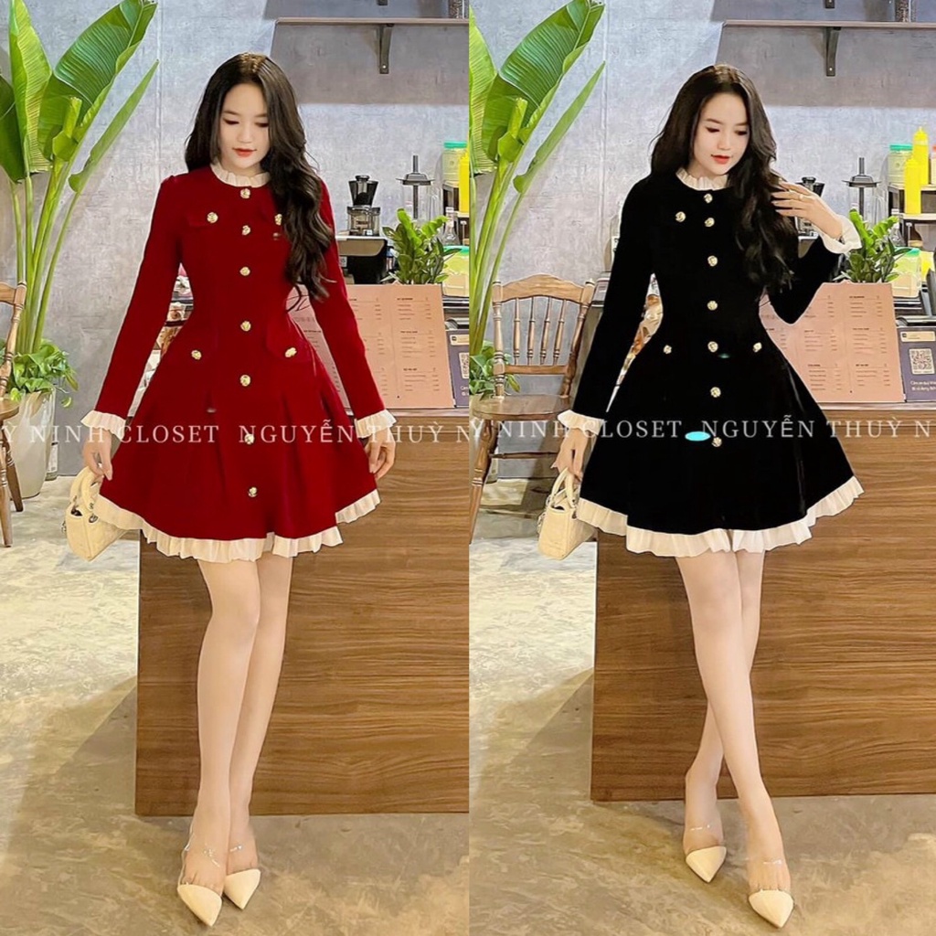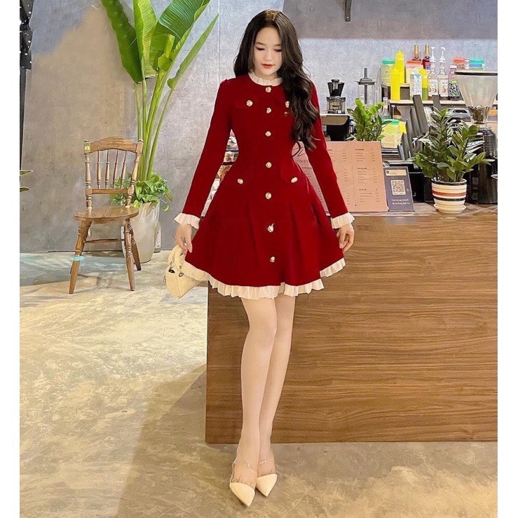 Váy nhung Pha Bèo Trắng Tiểu Thư Dáng Xoè Siêu Xinh, váy đỏ phối đính cúc cổ phối viền trắng mặc noel,Tết HV231