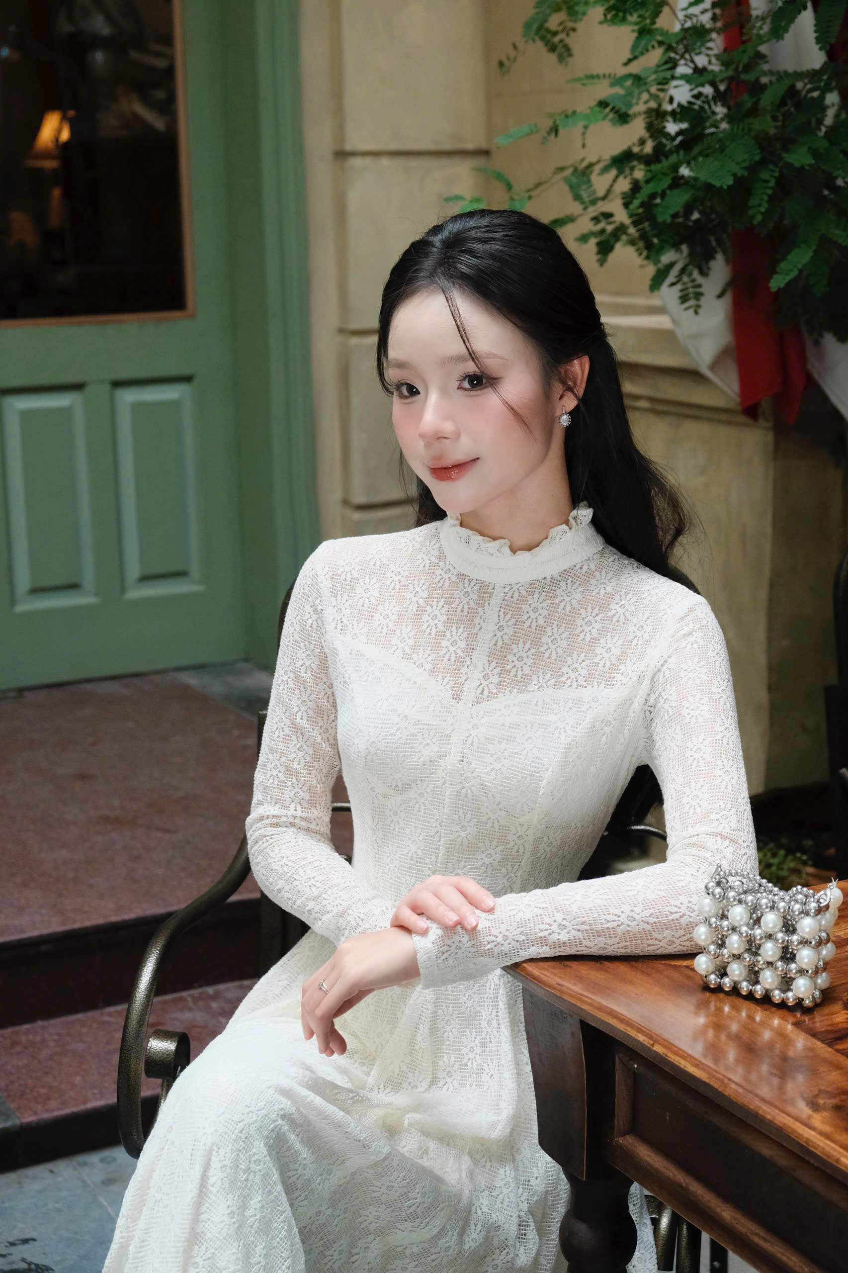 Tay dài bo nhẹ, giúp tổng thể váy vừa kín đáo vừa thanh lịch.