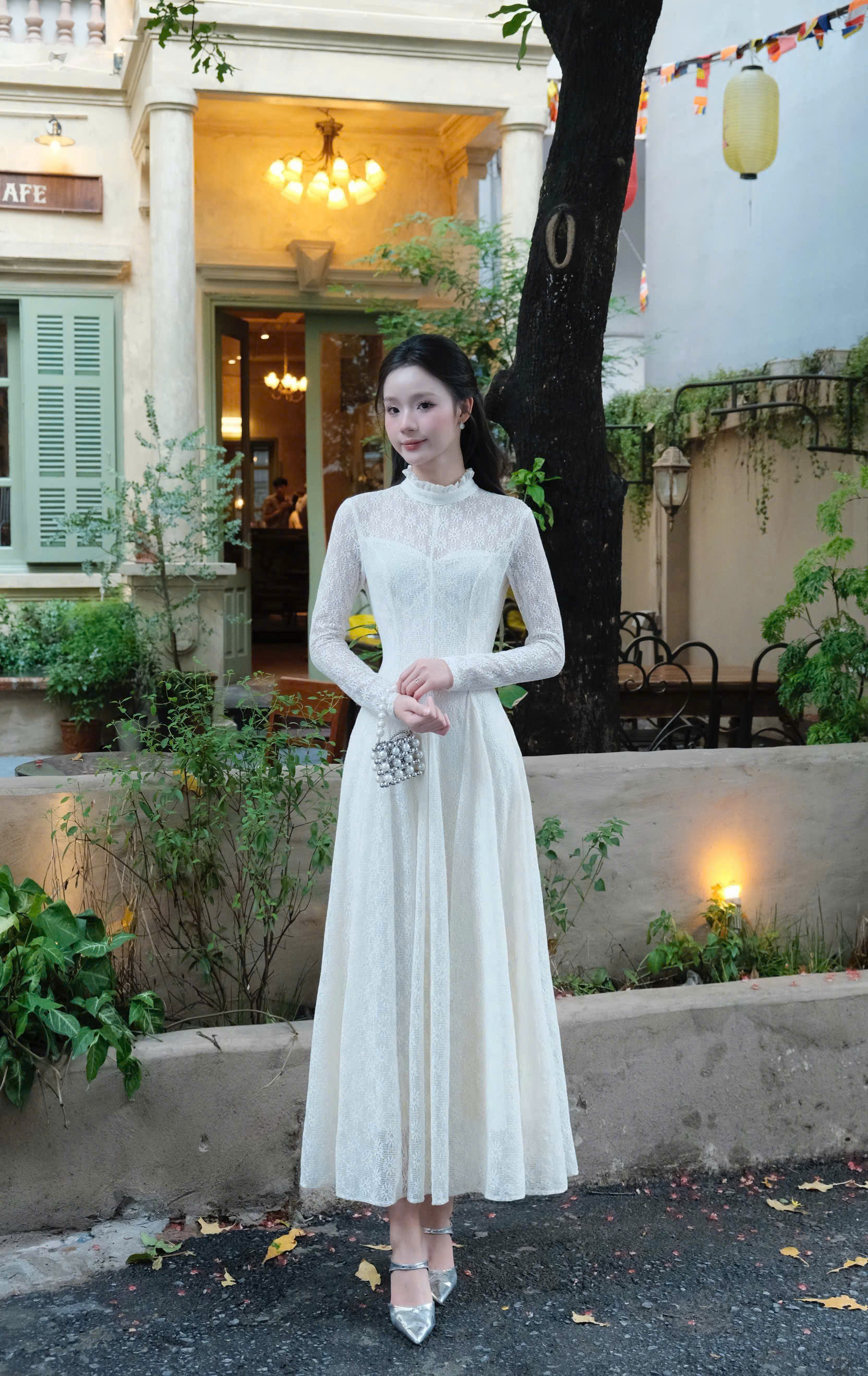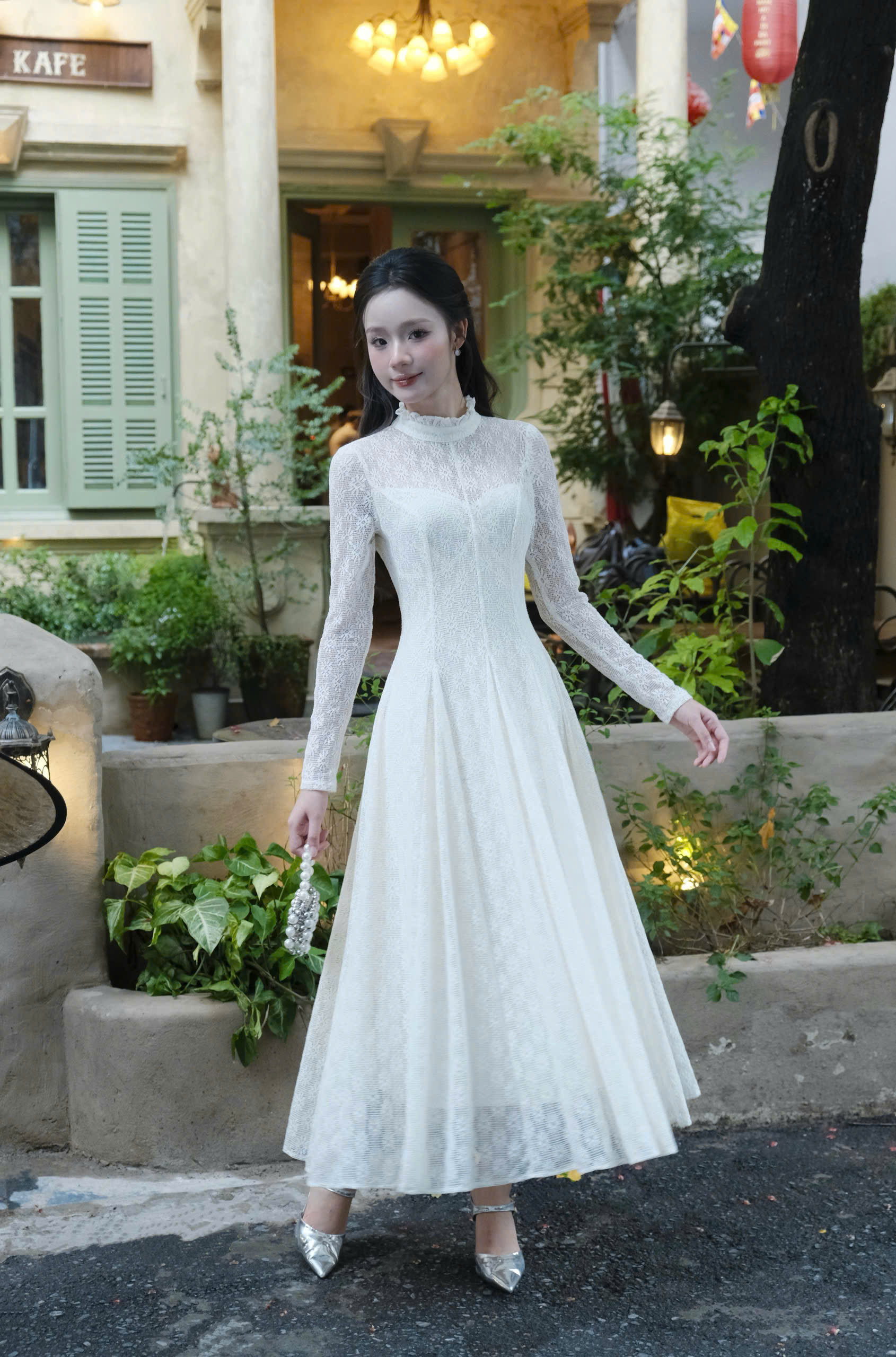 Váy ren hoa cổ bèo dáng xoè, dài tay, lót cotton co giãn – Mio Lady