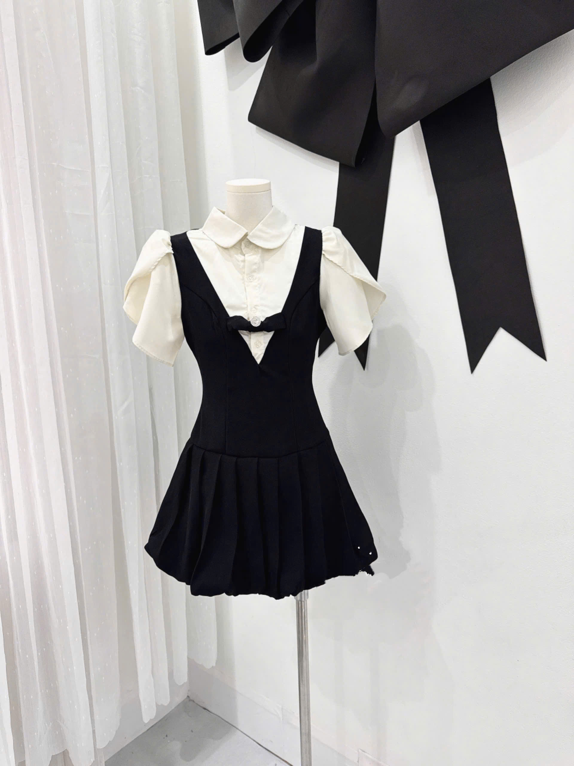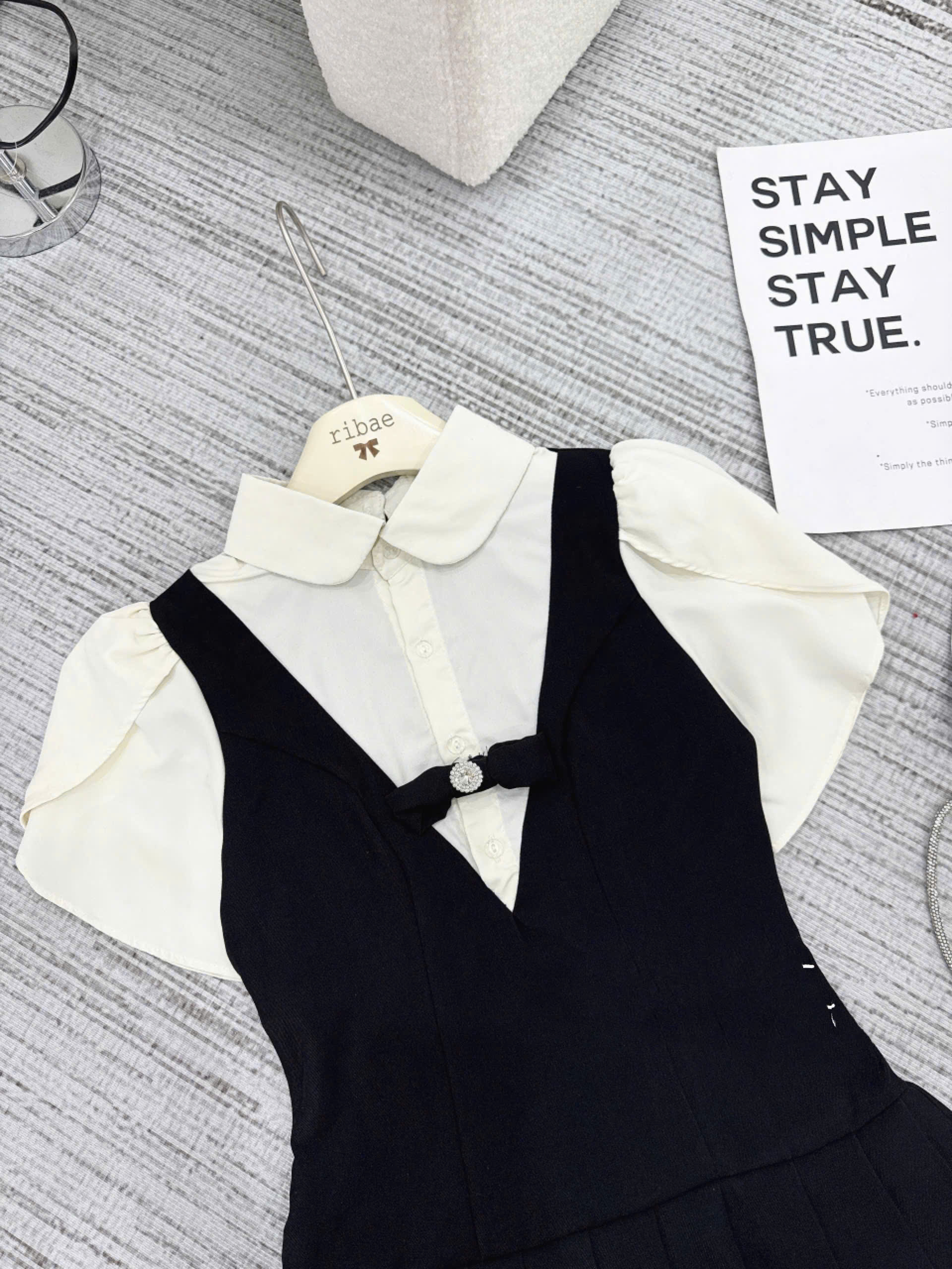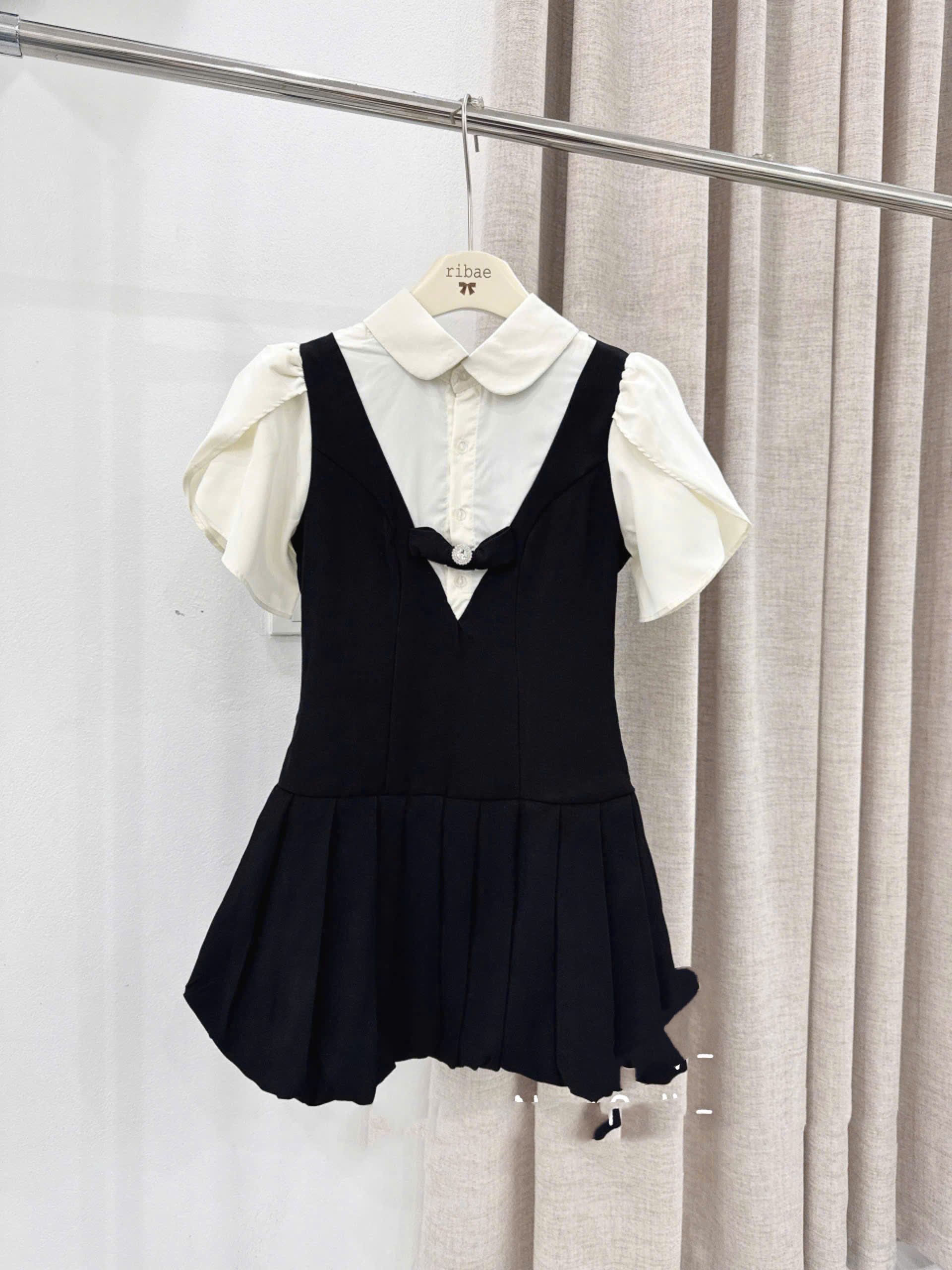 Váy Sơ Mi Tay Bồng Cổ Sen Đính Nơ Phối Yếm Xếp Ly Chéo Hàn Tiểu Thư Ảnh Thật Trải Sàn Lollaye