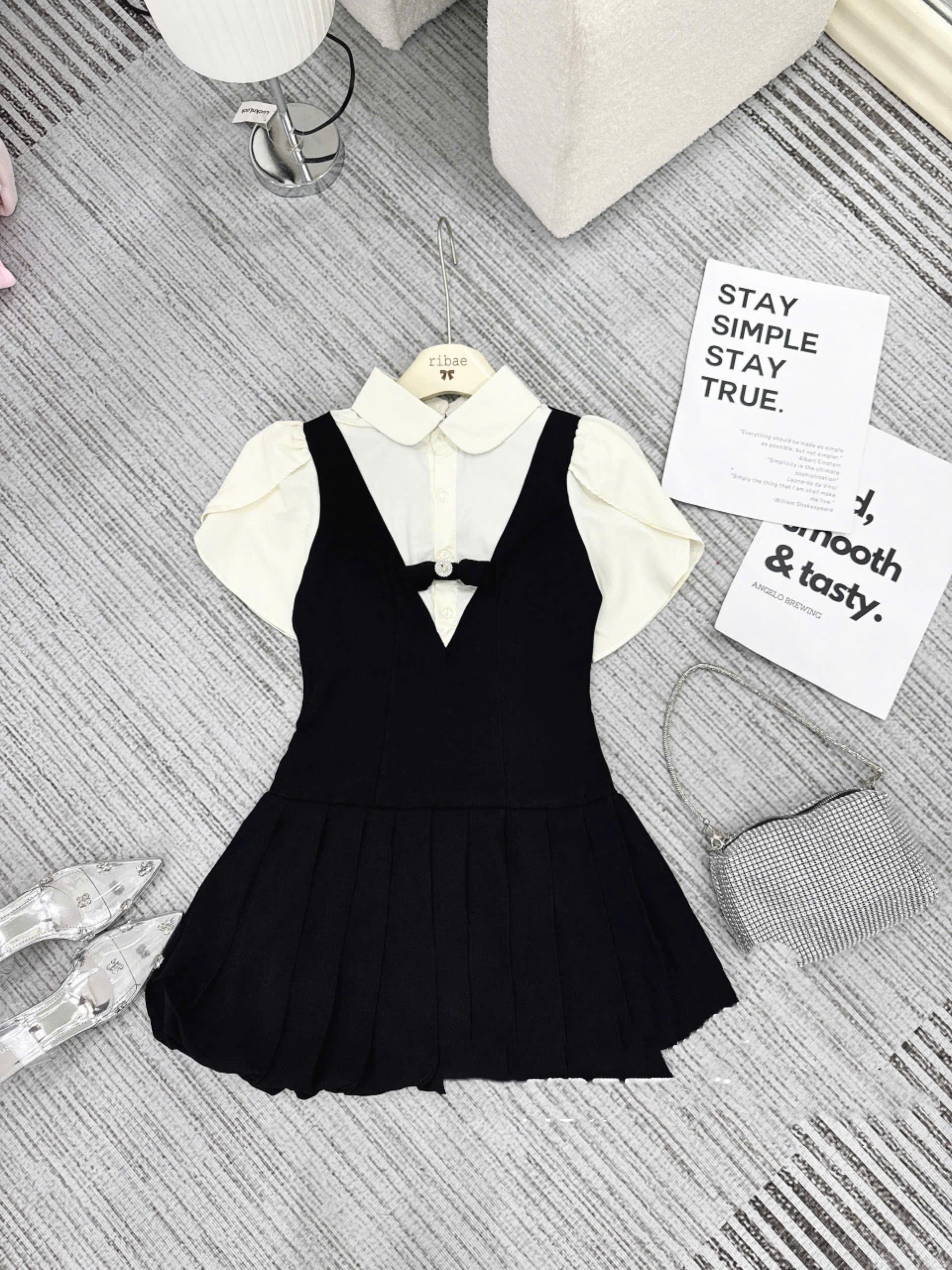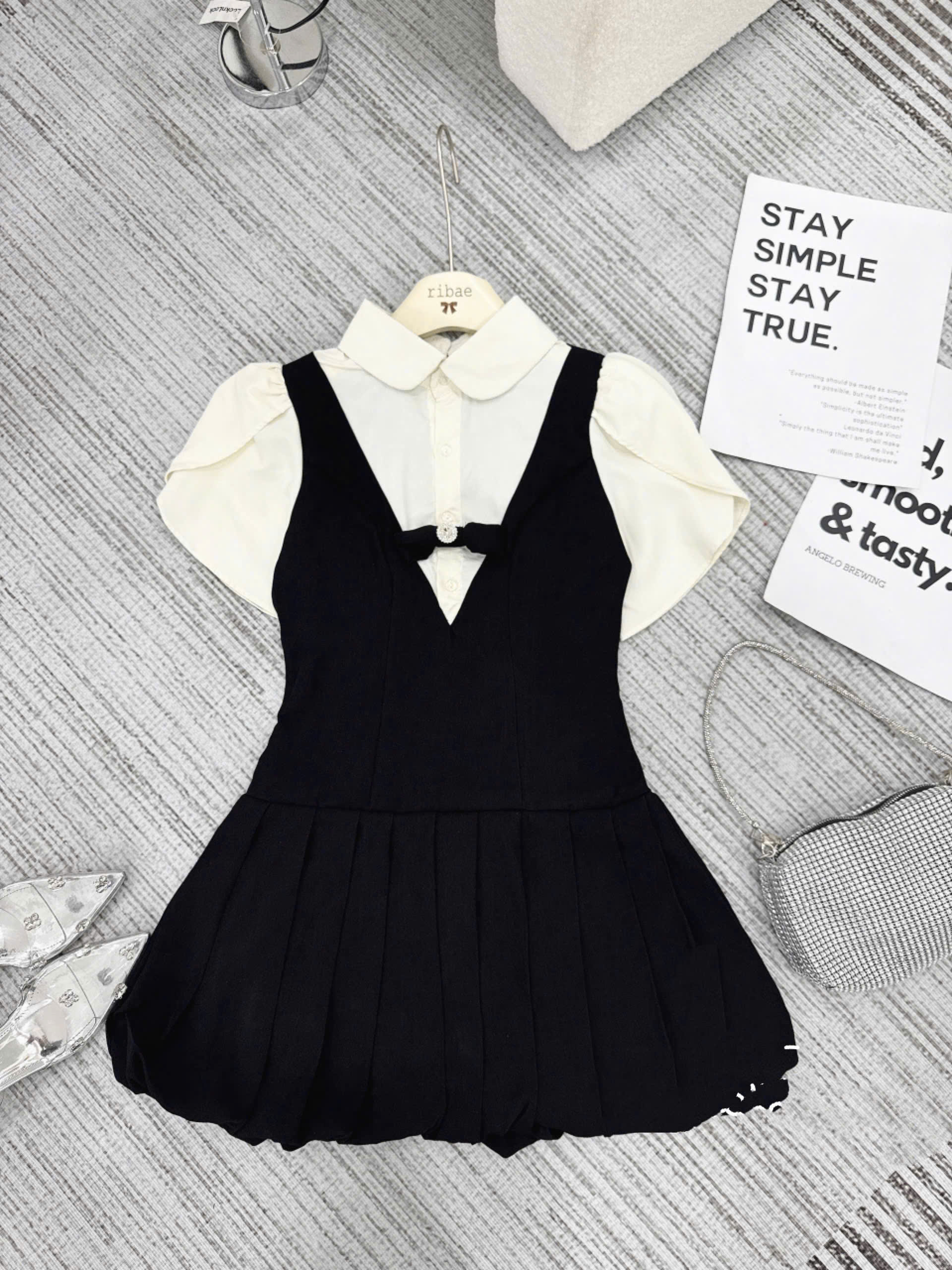 🌸 Set áo sơ mi đính nơ kèm yếm xếp li tiểu thư cao cấp !